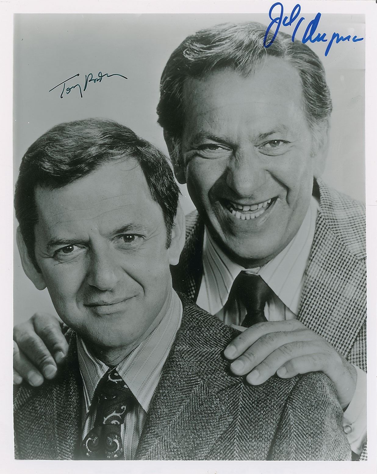 Glossy 8 x 10 photo of Felix Unger and Oscar Madison from the classic sitcom The Odd Couple, signed in black ink by Tony Randall and in blue felt tip by Jack Klugman. In fine condition.