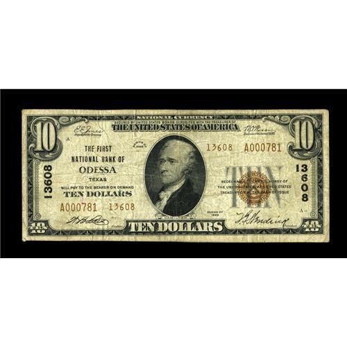 <B>Odessa, TX</B></I> - $10 1929 Ty. 2 <B>The First NB</B></I> Ch. # 13608<BR>Tonight's <B>Fine</B></I> example is one of just two of its type and denomination verified in the census and has been off the market since we sold it in 1999. Expect this much in demand west Texas note to reach or exceed...<BR><BR><b>Shipping:</b> Coin/Currency (<a target="_blank" href="http://www.heritageauctions.com/common/shipping.php">view shipping information</a>)