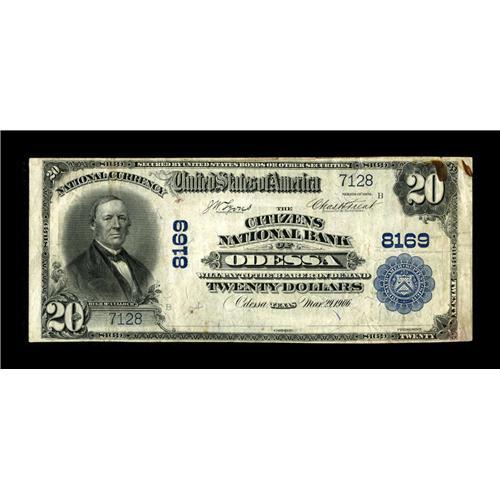 <B>Odessa, TX</B></I> - $20 1902 Plain Back Fr. 651 <B>The Citizens NB</B></I> Ch. # 8169<BR>A just plain rare note from a rare west Texas bank and town. <B>Fine,</B></I> with the signatures a bit faded and a couple of small brown spots near the top right corner.<BR><BR><b>Shipping:</b> Coin/Currency (<a target="_blank" href="http://www.heritageauctions.com/common/shipping.php">view shipping information</a>)