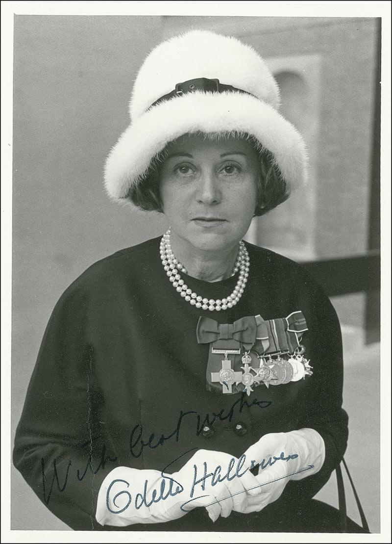 Allied heroine of World War II, sent into Nazi-occupied France to work with the French underground. Rare vintage matte-finish 4.5 x 6.25 photo of Hallowes wearing her medals, signed in fountain pen, “With best wishes, Odette Hallowes.” In fine condition, with a couple of light vertical creases lightly affecting sentiment. Hallowes was appointed a Member of the Order of the British Empire and was the first of three World War II FANY members to be awarded the George Cross. She remains the only woman to have received the George Cross whilst alive, all other female GC awards to date being posthumous. She was also appointed a Chevalier de la Légion d'honneur for her work with the French resistance.