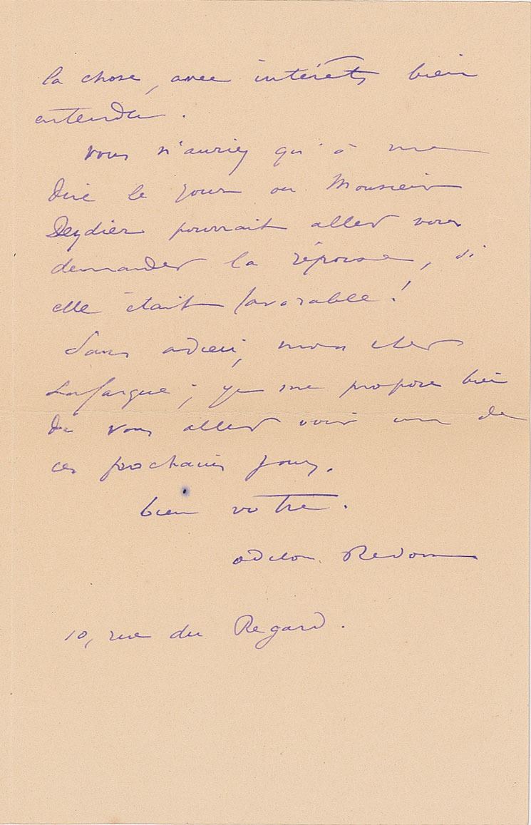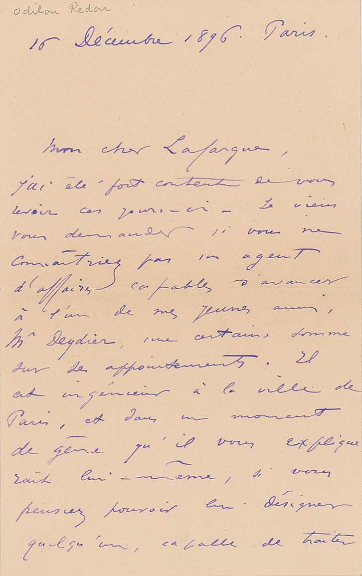 French symbolist painter, printmaker, draughtsman, and pastellist (1840–1916). Untranslated ALS in French, two pages on two adjoining sheets, 4.5 x 7, December 16, 1896. In fine condition.