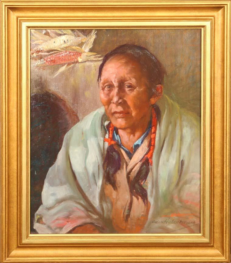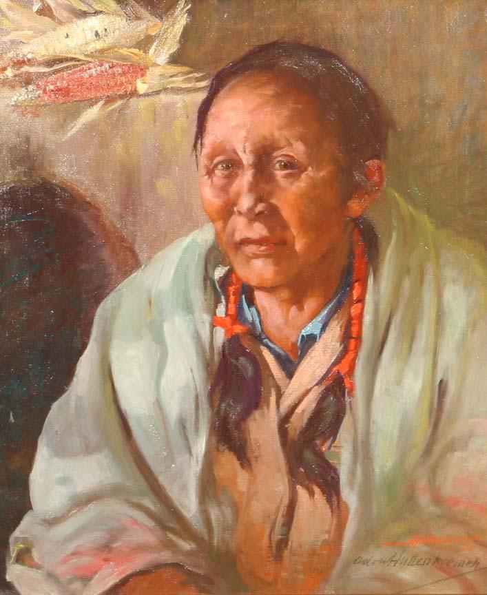 Odon Hullenkremer (1888-1978). Taos Indian Woman With Corn. 20" x 24" oil on canvas. Double signature lower right. (est $3,000-4,000). Provenance: Ex-Harmsen Collection, Denver, CO. . For condition reports please visit: www.auctioninsantafe.com/cr2011.pdf