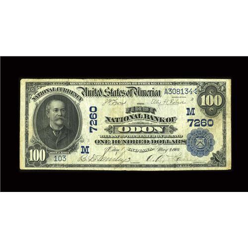 <B>Odon, IN</B></I> - $100 1902 Date Back Fr. 689 <B>The First NB</B></I> Ch. # (M)7260<BR>An attractive and newly discovered Indiana high denomination example from a bank which is just plain rare in large, with only three such examples recorded in the new Kelly census. Pen signed <B>Fine-Very Fine,</B></I> a note certain to see some spirited bidding before the hammer falls tonight.<BR><BR><b>Shipping:</b> Coin/Currency (<a target="_blank" href="http://www.heritageauctions.com/common/shipping.php">view shipping information</a>)