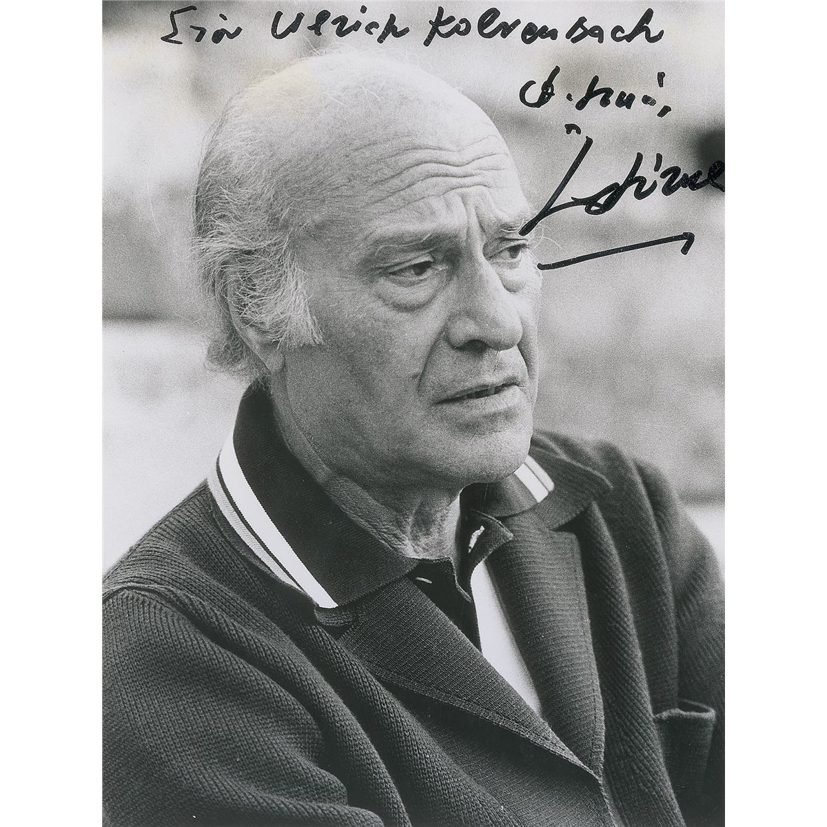 Romantic modernist poet and essayist (1911–1996) who was awarded the Nobel Prize in Literature in 1979. Glossy 7 x 9.5 photo of Elytis, signed and inscribed in black felt tip. In fine condition, with light scattered surface impressions and faint areas of discoloration to upper left.