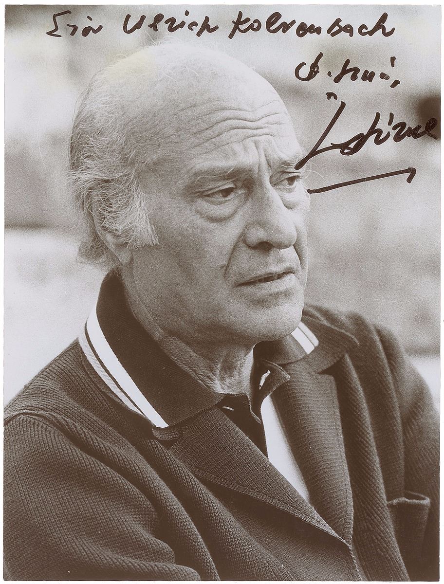 Romantic modernist poet and essayist (1911–1996) who was awarded the Nobel Prize in Literature in 1979. Nice glossy 7 x 9.5 head-and-shoulders photo of Elytis, signed and inscribed in black felt tip. Reverse bears a Argyropoulos photo press stamp. Slight scattered surface impressions, a bend to left edge, and two areas of discoloration to upper portion, otherwise fine condition.