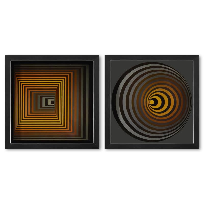 "Oervegn - II et Vonal - Fegn de la serie Vonal (Diptych)" is a set of heliogravure prints on paper, published in 1971, by Victor Vasarely (1908-1997). These pieces come custom framed, with a letter of authenticity and with a 1976 Vasarely paperback. Measures approx. 11.5" x 11.5" (frame), 9" x 9" (image).