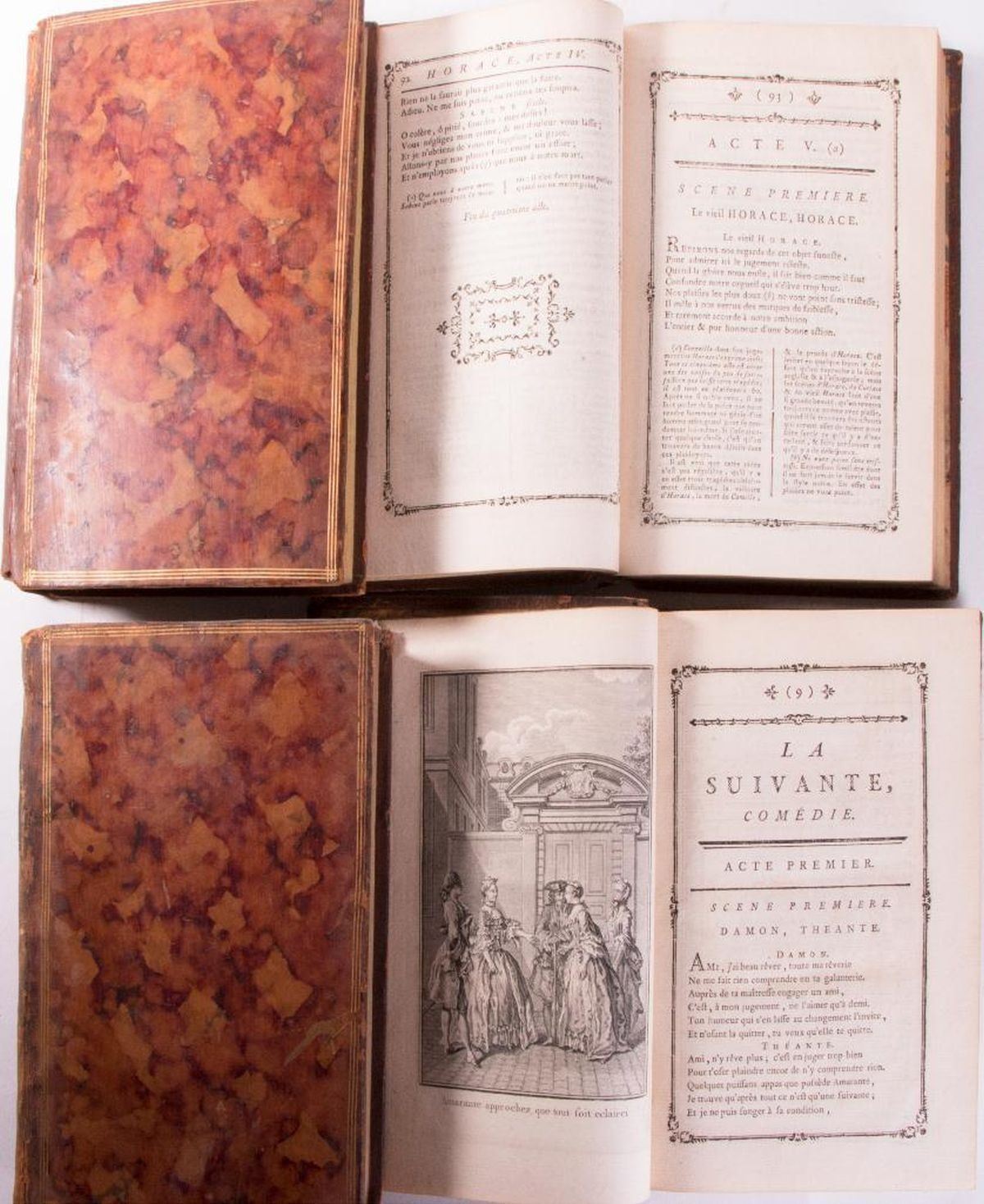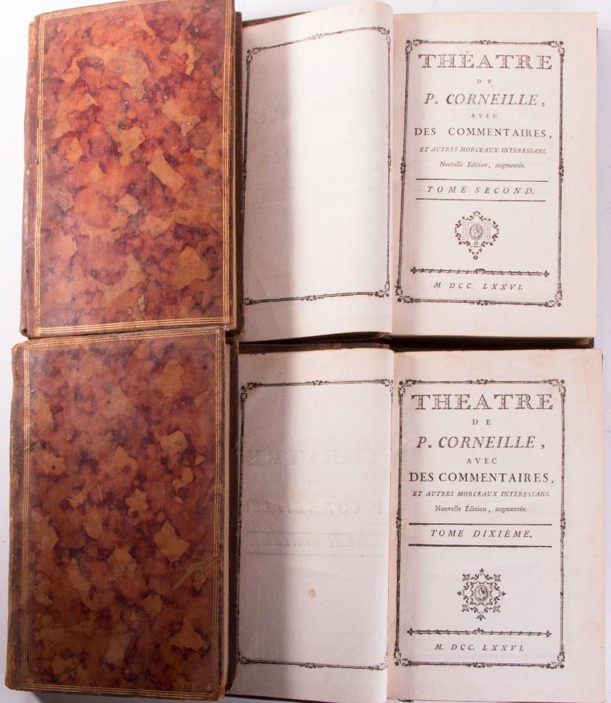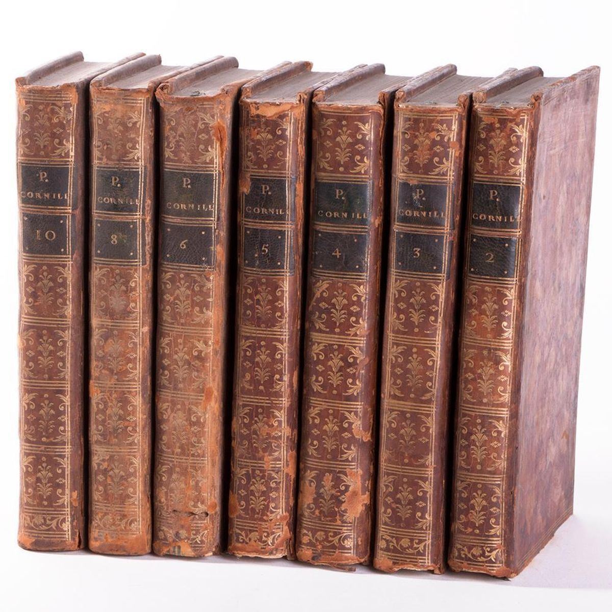 Title: Theatre de P. Corneille avec des Commentaires, et autres morceaux Interessans, Nouvelle Edition Augmentee Author: Pierre Corneille Place: Publisher: Date: 1776 Description: Oeuvres de Corneille. Volumes 2,3,4,5,6,8,10. Leather covers with gilt design and lettering. Tight pages. Condition: Good-Fair condition. Spine leather chipping, missing or bumped. Very little foxing to pages. Slight discoloration to pages. Some evidence of book worms on the spine.