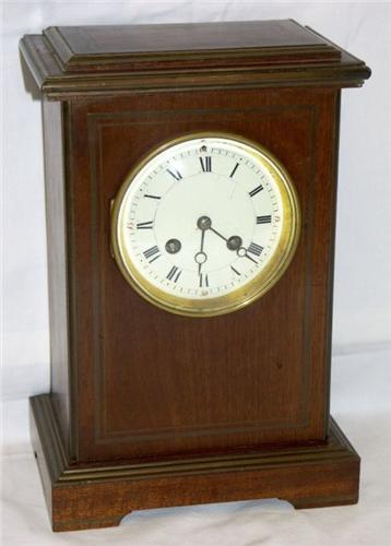 Pendulette de bureau en acajou marqueté avec filet en laiton, cadran émail, aiguilles Breguet, mouvement de Paris sonnant les heures et les demies sur gong, env. 1890