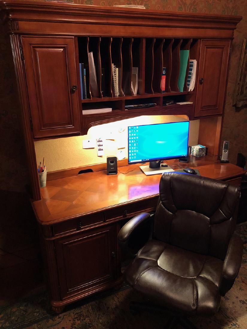 Double file cabinet with matching office desk, chair and rug. Desk with parkay table top, measures approx. 67" long by 24" deep by 76 tall. Double matching file cabinet measures 36" x 30" deep x 30" tall. Office chair and rug completes this set. Can be picked up at the Litchfield, CT estate.