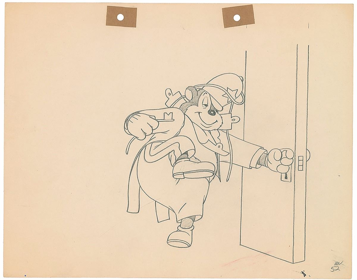 (Warner Brothers Studios, 1943) Original production drawing featuring the Mel Blanc–voiced Officer Bear from The Unbearable Bear directed by Chuck Jones, showing the tipsy ursine policeman opening a door. Accomplished in graphite on untrimmed 12 x 9.5 animation paper. Image measures 6.5 x 7.5. In fine condition.