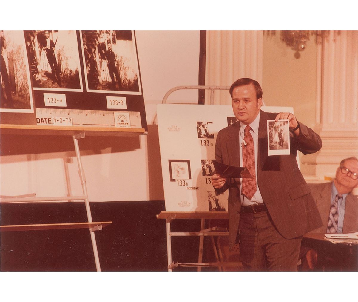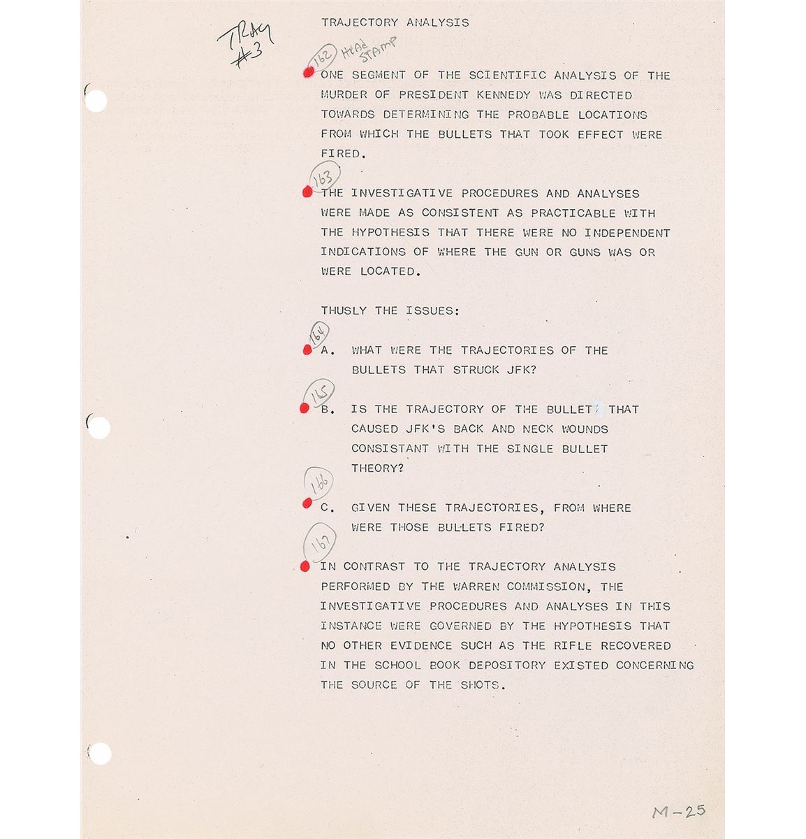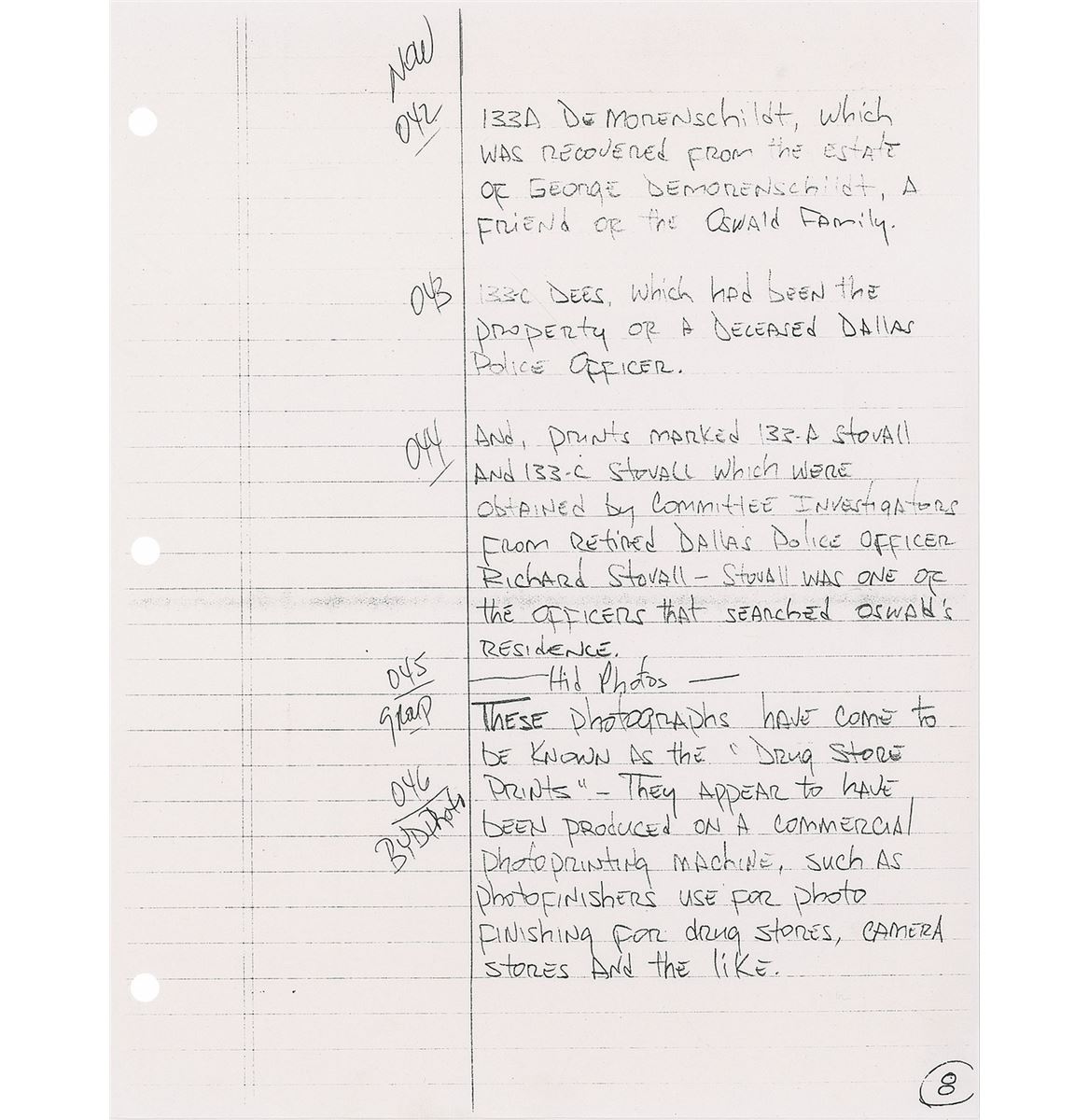 Impressive archive of papers from the estate of officer Cecil Kirk, known for his investigations into the authenticity of the infamous backyard photographs of Lee Harvey Oswald holding his rifle, as well as his examination of the rifle itself. The primary material is a 41-page set of photocopies of notes from his 1978 testimony before the House Select Committee on Assassinations concerning the authenticity of the often disputed photographs of Lee Harvey Oswald in his backyard holding the rifle he allegedly used to assassinate John F. Kennedy, with copious penciled corrections and emendations in Kirk’s hand throughout. A portion of these notes concerns the photos, in part: “It has been alledged [sic] that Oswald’s shadow on the ground in these photographs is entirely black and contains no detail…This allegation of the shadow being painted on a montage—like others—is based on viewing copy prints and not on first generation photographs—When the photographs are viewed properly and with objectivity—details in the shadows are clearly visible. Grass, a small branch—stones, leaves and a newspaper are seen.” Also includes two glossy 10 x 8 photos, one of the rifle in question and one showing the various Oswald negatives, a period 8 x 10 photo of a Dallas detective holding the rifle, and two candid color snapshots of the 1978 hearings, one showing Kirk delivering his testimony and the other showing former Texas Governor John Connally, who was wounded during the assassination. A magazine with an article about Kirk’s investigation and a typed statement on Select Committee on Assassinations letterhead about Kirk’s involvement are also present. In overall fine condition.