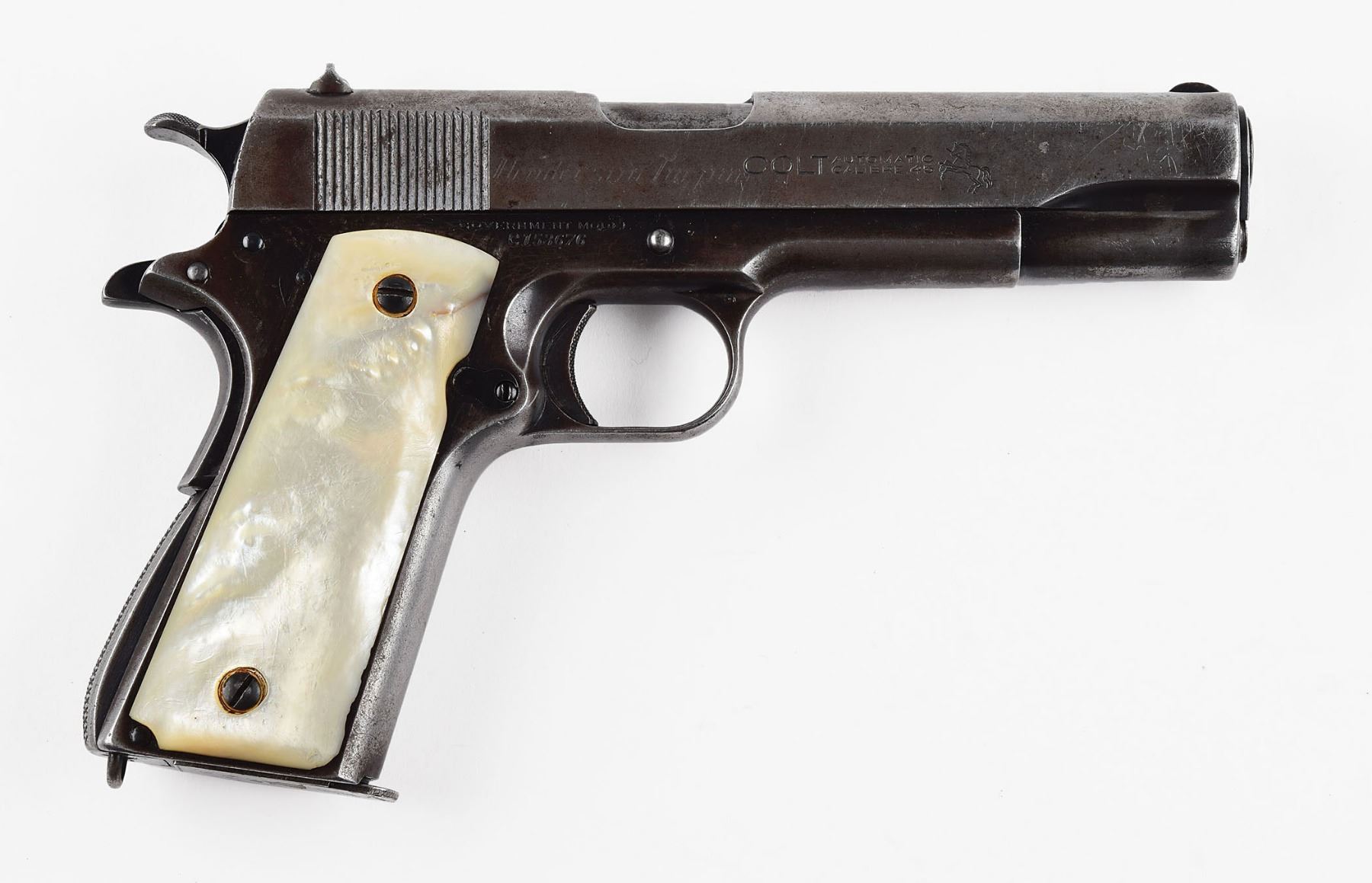 Desirable Colt Commercial Government Model pistol belonging to William Henderson ‘Ben’ Turpin, one of the first black police officers in Detroit Police Department. Serial #C153676, .45 ACP, 5? barrel with a fine, bright bore that has some minor freckling within the grooves at the breech. This is a 1928-made pistol with matching numbered frame and slide, that has retained about 45-50% of the original blue finish, mostly on protected areas of the frame. The remainder of the metal has a patina that ranges in color from dull plum-brown, to pewter gray. The slide is also hand engraved on the right side just below the ejection port, “Henderson Turpin,” in Gothic lettering. The right grip panel is a period mother-of-pearl replacement, but the original checkered walnut grip is present on the left and has distinct wear patterns indicative of heavy use. A single magazine with polished floorplate is included. Accompanied by a binder of research material about Turpin's career and a 2015 Colt Factory Letter.