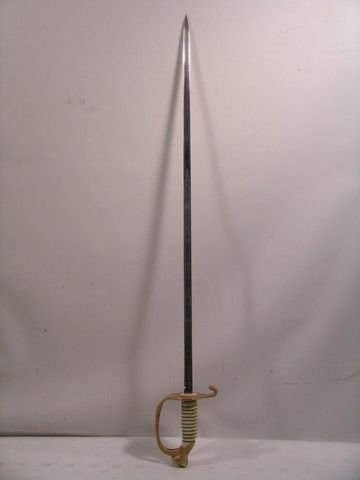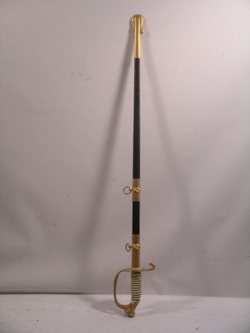 A prop sword used in the production of the 1982 film 'An Officer and a Gentleman', starring Richard Gere and Debra Winger. The film is about a man named Zack who tries to become an aviator with the help of his girlfriend, Paula (Winger). This is a background piece, which comes complete with a black and gold sheath. The handle has a decorative hand guard, and the blade has symbols engraved on it. (Measures approx. 5.25" x 3" x 36")