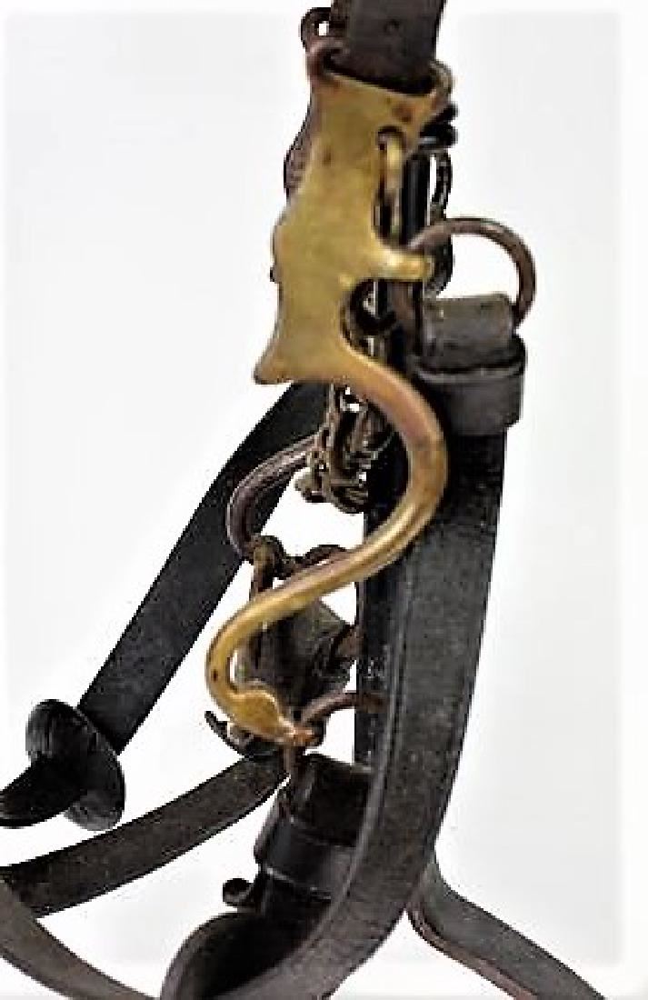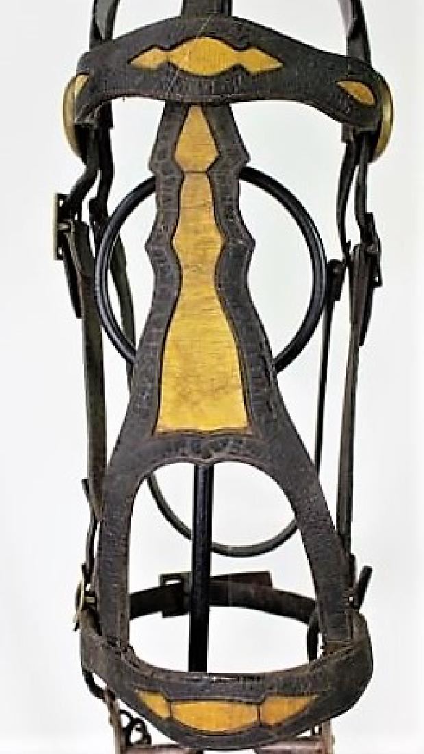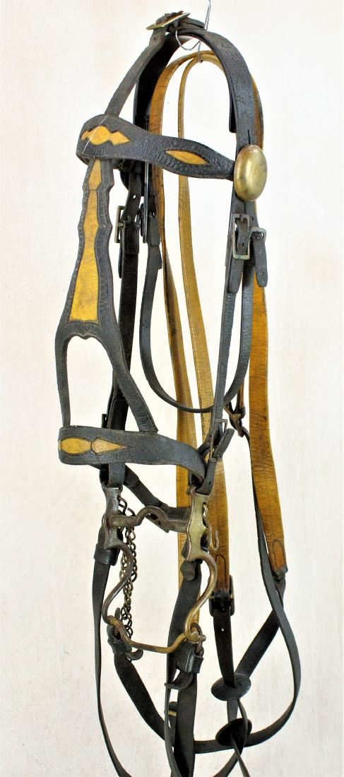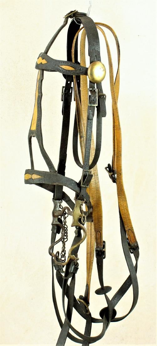 Popular 1850's officer purchased bridle, yellow trimmed inset leather to the face, brow and nose band with matching closed reins, and finished with fantastic brass clad bit. Bridle shows original 2 1/4" brass medallions and square buckles, displays nicely.