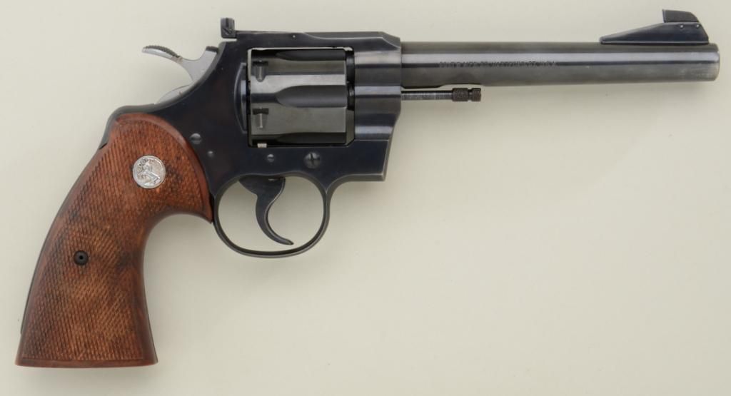 Officers Model Match DA revolver, .38 Special cal., 6” barrel, blue finish, checkered medallion wood combat grips, #904168. This gun is in overall fine condition showing some muzzle and high point wear, fine bore,action and markings; grips are very good to fine with some scattered mars to checkering on the right grip. Est.: $275-$550.