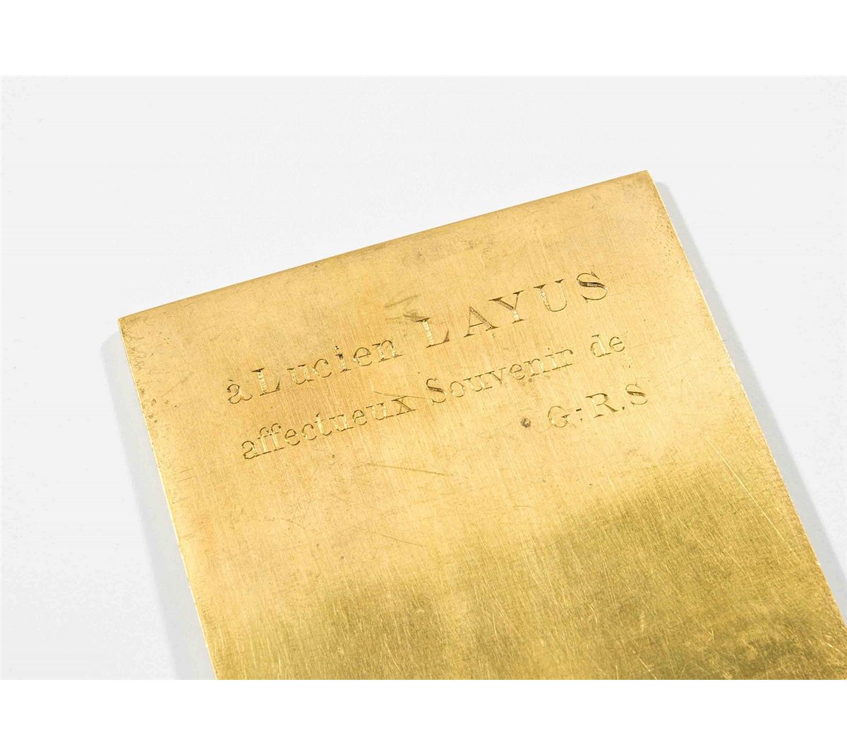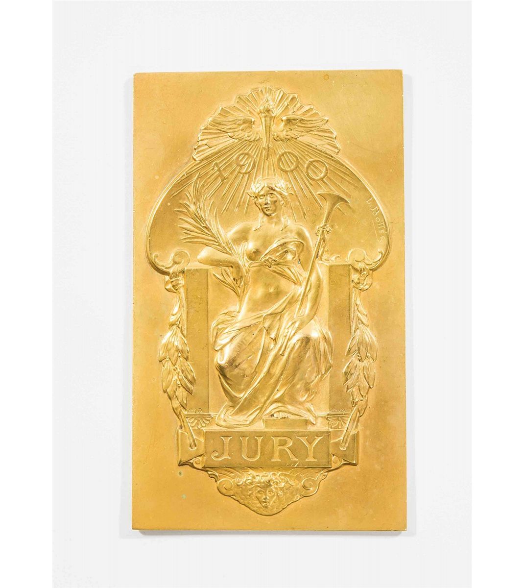 Stunning gold-plated bronze plaque, 3.25 x 5.5, featuring an impressive raised relief of Fame seated on a throne, a palm branch in her right hand and a trumpet in her left, with the artist’s name along the right edge, “1900” printed at the top, and “Jury,” at the bottom. Reverse bears a hand-engraved presentation, in French, which reads, “A Lucien Layus, affectuex souvenir, G. R. S.” Plaque rates extra fine plus. Plaque was presented by Gustave Roger Sandoz, General Secretary of the French Committee of Expositions, to Layus, who was a prominent member of the prestigious 1900 World’s Fair Committee. He was also reported to have been the president of Director of Judges for the Olympics and other exposition events. To the best of our knowledge, this gilt gold example is the only one of its 1900 format to ever be offered.