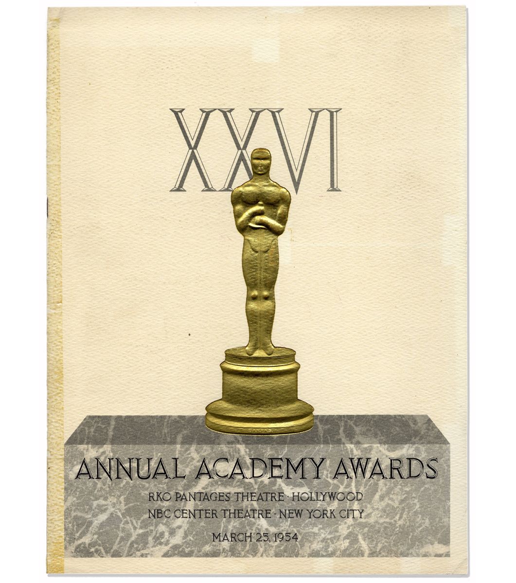 Program from the 25 March 1954 presentation of the 27th Annual Academy Awards, held at the RKO Pantages Theatre in Hollywood. Bright, clean pages list all nominees and the program of events for the ceremony, during which ''On The Waterfront'' took home Best Picture. Measuring 9'' x 12'', it has a beautiful embossed cover with a gilt Oscar statue. Some toning to cover, particularly along left edge, else near fine.