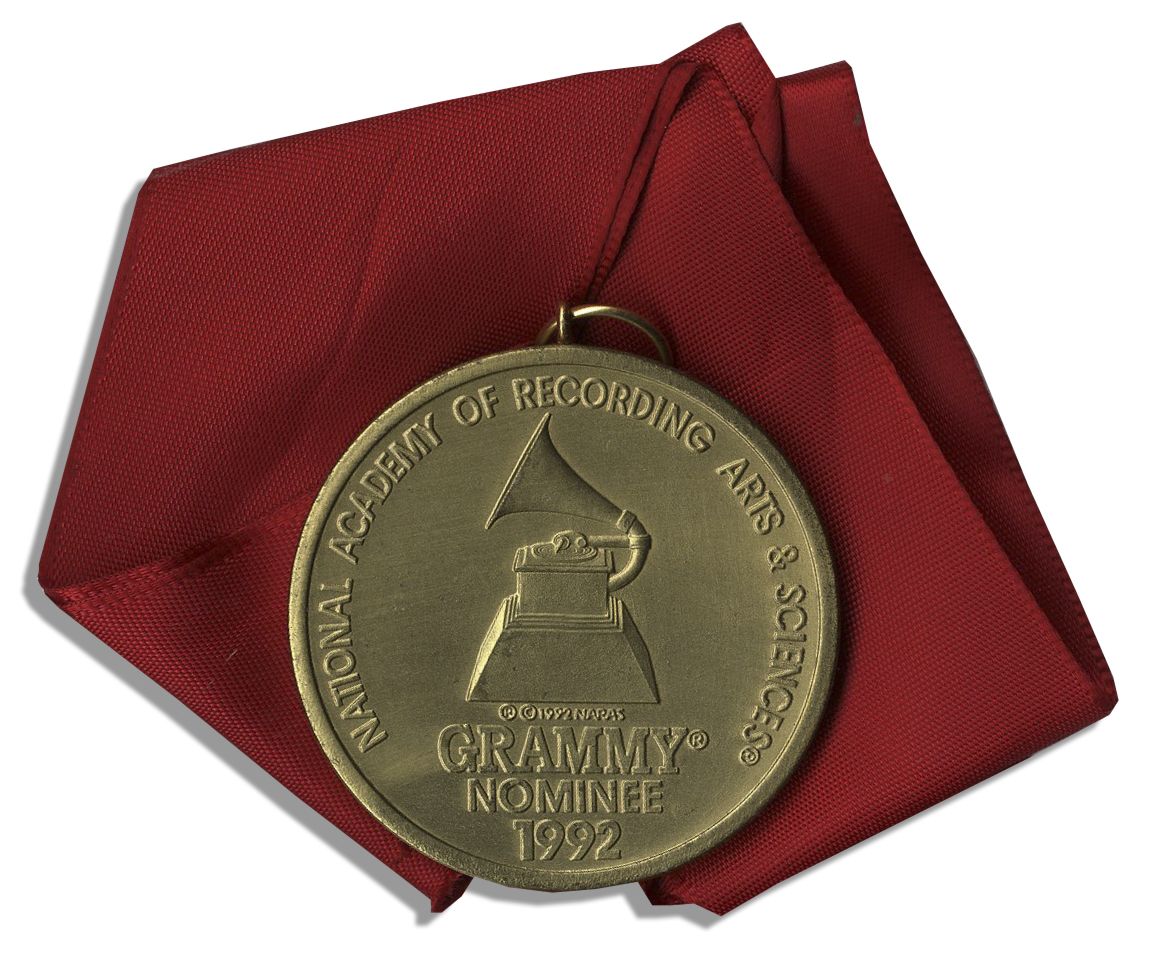 Grammy nominee award bestowed in 1992 at the 34th Grammy Awards. Circular bronze medal with a gramophone engraved at center reads: ''National Academy of Recording Arts & Sciences / Grammy Nominee / 1992''. Medal is attached to a red satin ribbon. Medal measures 2'' in diameter; ribbon measures 1.75'' x 17''. Ribbon is starting to fray and wear near medal, else near fine condition.