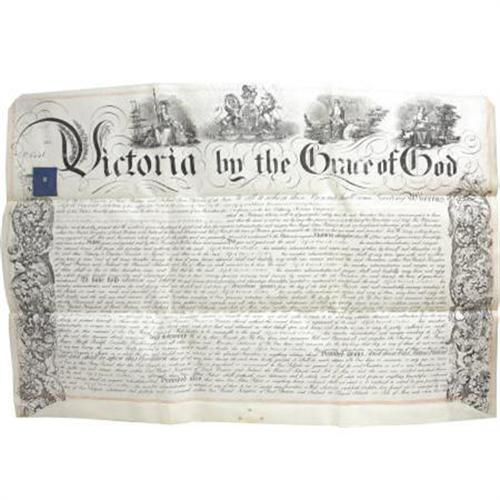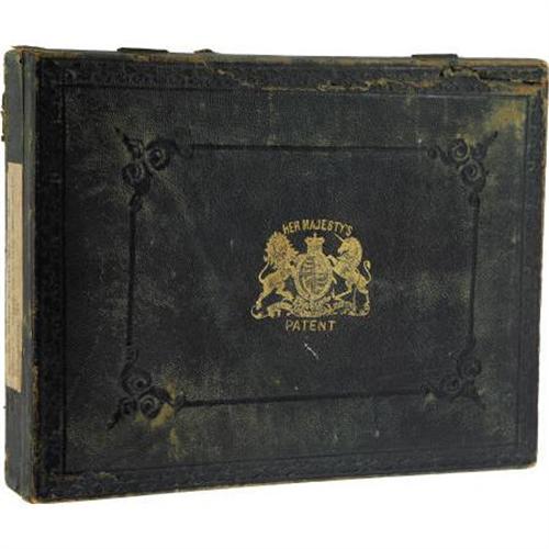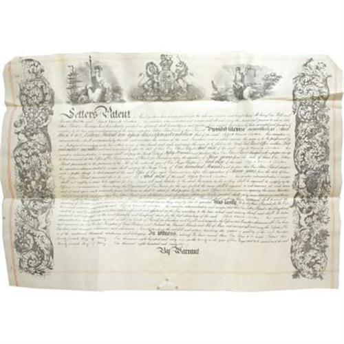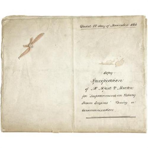 <B>Official British Patent Documents in Box from Her Majesty’s Patent Office</B></I>, Patent No. 1441, May 22, 1868, granted to Alfred V. Newton for Improvements in the Rotary Steam Engine. <BR><BR>The <B>Patent Office Box</B></I>, measuring 8.5” x 11.25” x 2”, is made of wood, covered with brown leather on the outside, beige paper on the inside, and connected by two metal hinges and clasp. The left side of the container includes an identification tag. The container is in very good condition: the exterior leather is worn and includes some tears and chipping on the front; the interior paper is intact, except for some moderate tears and chipping.<BR><BR>The three folded documents inside include:<BR><B>Patent Grant Document No. 1441</B></I>, parchment, 30.5” x 23” (unfolded), printed, with illustrations, on both sides and including handwritten information pertaining to the inventor and his invention: <I>“Alfred Vincent Newton for the Office of Patents 66 Chancery Lane in the County of Middlesex Mechanical Draftsman”</B></I> for <I>“Improvements in Rotary Steam Engines”. </B></I>Attached at top left is a five-pound patent stamp. <B>Condition</B></I>: fine with folds and minor creases.<I> <BR></B></I><B>Patent Warrant Document No. 1441</B></I>, parchment, 25.25” x 17.75” (unfolded), printed, with illustrations, on one side with the name of the inventor handwritten, describes the conditions attached to the patent. <B>Condition</B></I>: fine with folds, minor creases, and some yellowing.<BR><B>Specifications Document</B></I>, 6.75” x 8.5” (folded), printed, containing the inventor’s specifications for “Improvements in Rotary Steam Engines.” <B>Condition</B></I>: good with soiling and some foxing.<BR><BR><b>Shipping:</b> Books & Catalogs (<a target="_blank" href="http://www.heritageauctions.com/common/shipping.php">view shipping information</a>)