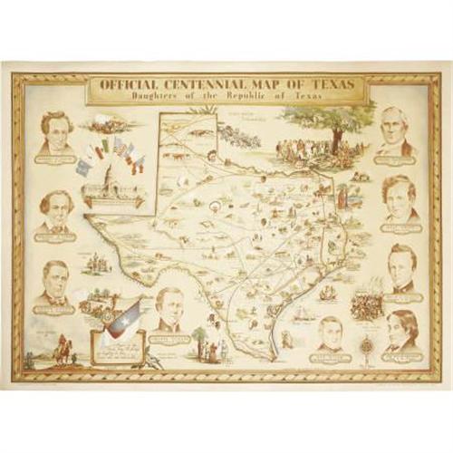 <B>Official Centennial Map of Texas</B></I>, 34.25" x 25". This 1934 Daughters of the Republic of Texas full-color-lithograph map was produced, published, and copyrighted by C. M. Burnett and lithographed by Utter and Evans, Inc. The map of Texas, including cities, roads, wildlife, and historic events, is surrounded by portraits of icons Stephen F. Austin, Mirabeau B. Lamar, Anson Jones, Colonel Fannin, Ben Milam, Col. David Crockett, Col. William B. Travis, Deaf Smith, and General Sam Houston. Officially endorsed by the Texas Centennial Commission. The map, never folded, is in fine condition with minor edge creases and one tiny tear on the right edge. <I>Ex. Dallas Historical Society.</B></I><BR><BR><b>Shipping:</b> Flat Material, Large (<a target="_blank" href="http://www.heritageauctions.com/common/shipping.php">view shipping information</a>)