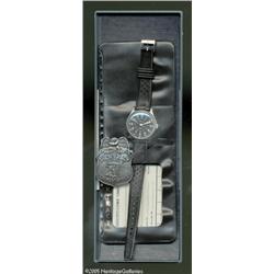 <B>Official Dick Tracy Detective Watch by Sovereign (Sovereign, 1957).</B></I> Gorgeous watch set includes plastic wallet, ID card, badge, and watch. The watch has precision Swiss movement, is waterproof, shock-resistant, anti-magnetic, and has read-in-the-dark luminous hands and dial. All items are in NM/MT condition, plastic box has some light scuffing and minor damage to the sticker. A superb piece of Tracy memorabilia. <I>From the Collection of Larry Doucet</B></I>.