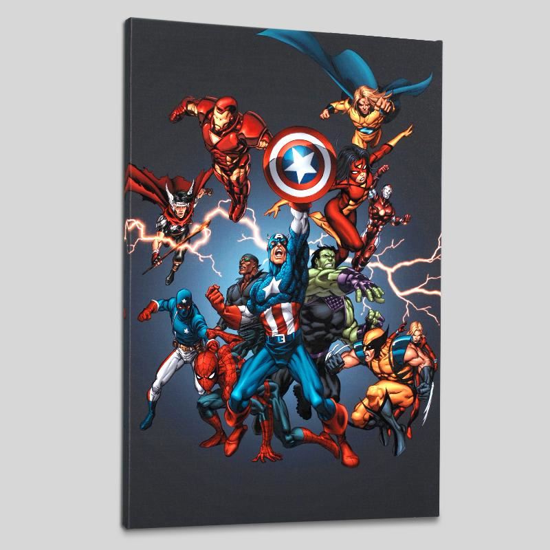 A piece of comic book history, this limited edition, from original art by Tom Grummett, depicts an action packed scene featuring the Avengers. While working for Marvel, Tom Grummett was the penciller on the Thunderbolts series and also co-created the X-Men Forever series. "Official Handbook: Avengers 2005" is a limited edition giclee on canvas by Tom Grummett presented by Marvel Comics! This piece comes gallery wrapped. Includes Certificate of Authenticity! Measures approx. 18" x 27" (image); 1.5" (depth).