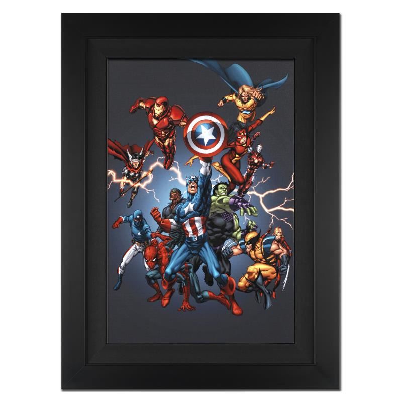 A piece of comic book history, this limited edition, from original art by Tom Grummett, depicts an action packed scene featuring the Avengers. While working for Marvel, Tom Grummett was the penciller on the Thunderbolts series and also co-created the X-Men Forever series. "Official Handbook: Avengers 2005" is an extremely limited edition giclee on canvas by Tom Grummett presented by Marvel Comics, hand signed by the great Stan Lee and numbered out of only 10! This piece is custom framed and ready to hang. Includes Certificate of Authenticity! Measure approx. 25" x 34" (with frame), 18" x 27" (image).