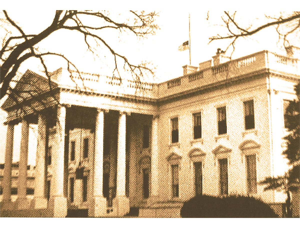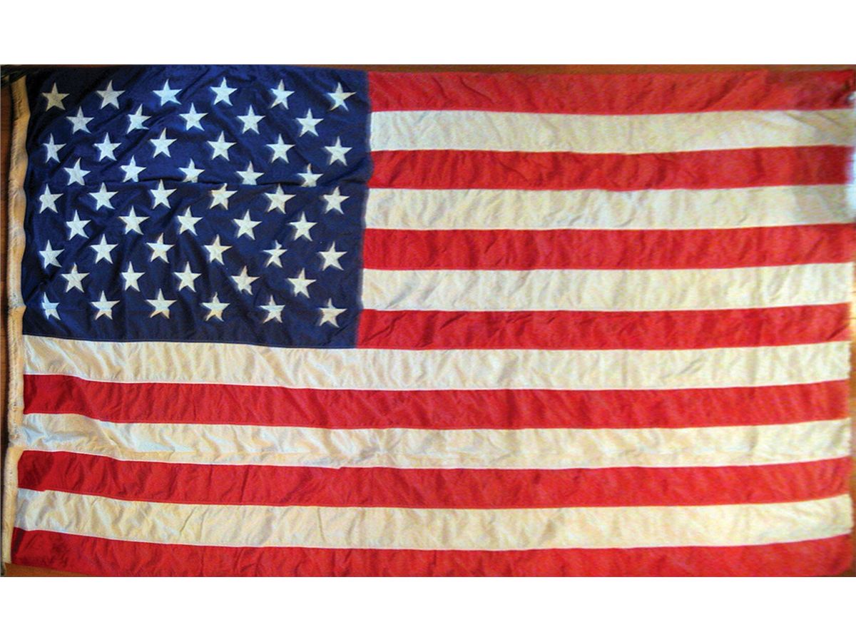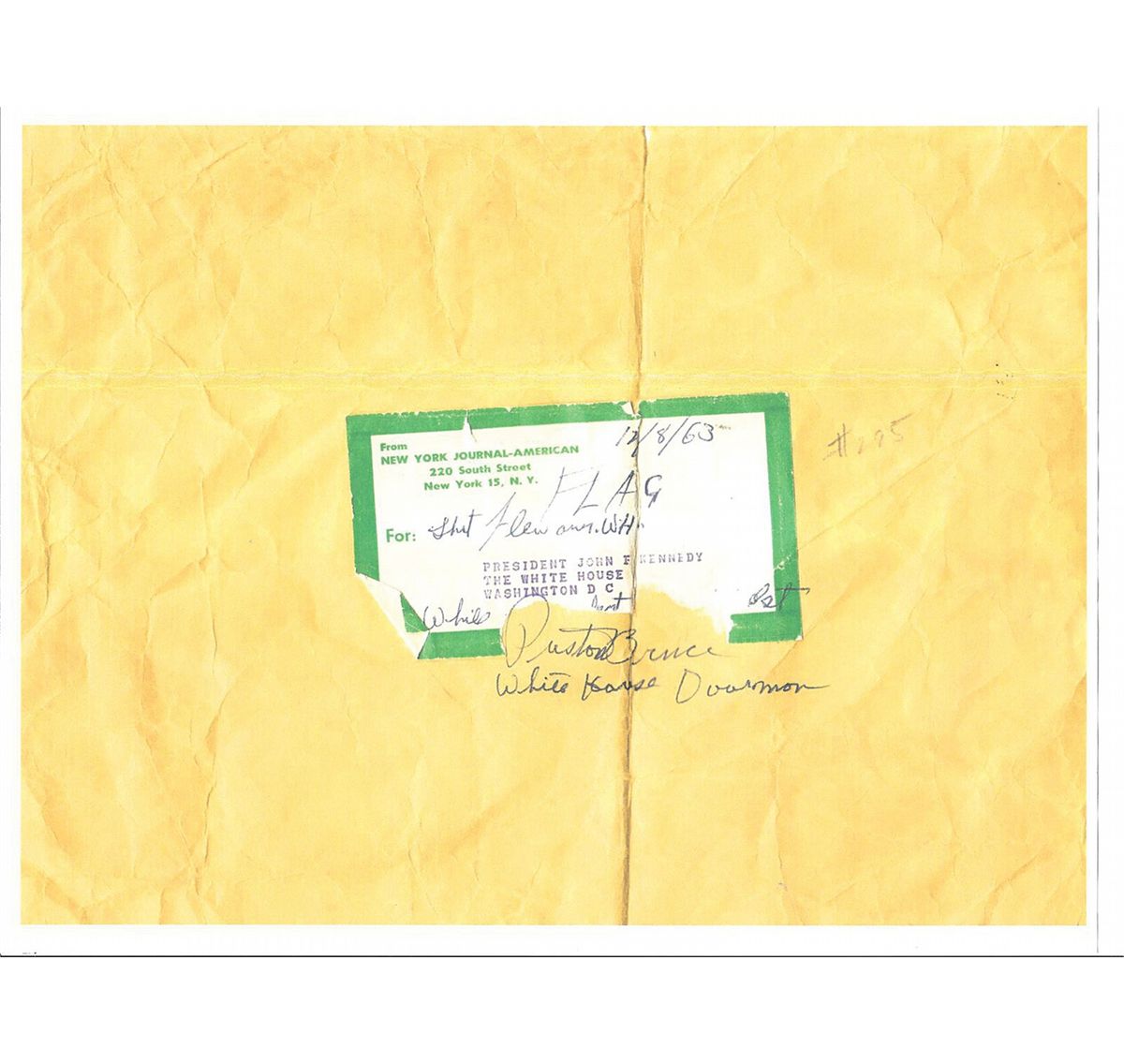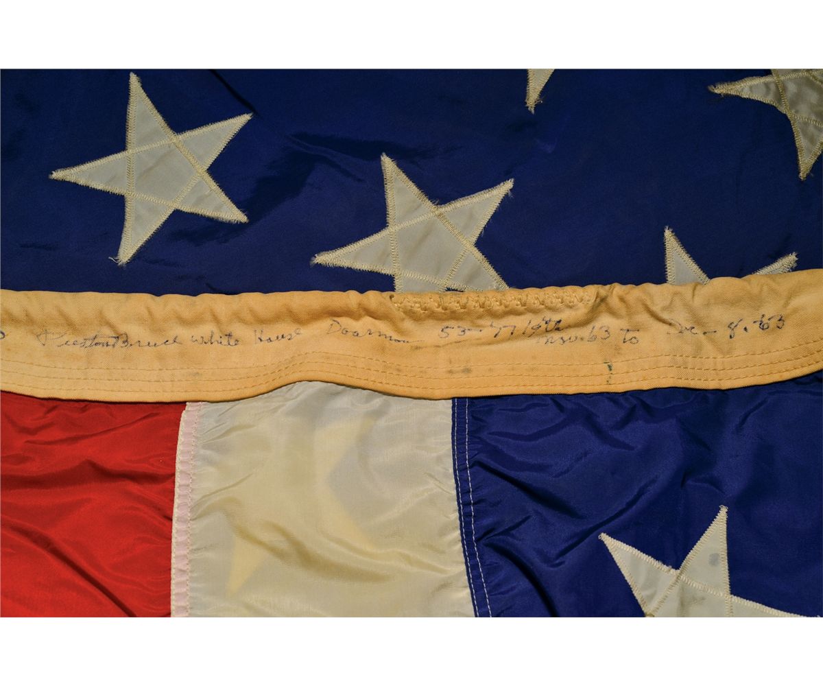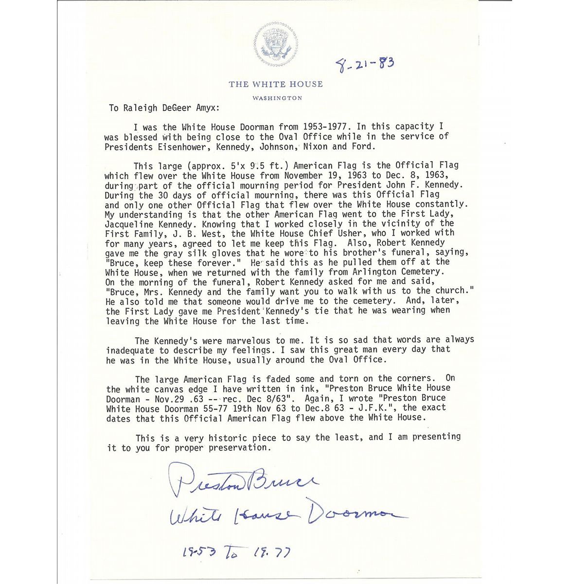 Historic American flag, approximately 9.5 x 5 feet, which flew over the White House from November 19, 1963, to December 8, 1963, during part of the official mourning period for John F. Kennedy. This flag was presented to White House Doorman Preston Bruce and is signed in ink along the white border, “Preston Bruce, White House Doorman—November 22, 63—Recv. Dec. 8 /63,” and “Preston Bruce—White House Doorman, 53–77 [the 24 years that Mr. Bruce served at the White House], 19th Nov. 63 to Dec. 8 63—J.F.K.” Included is a letter from Preston Bruce, written on White House stationery, which states: “I certify that this flag was flown over the White House during the 30 day mourning period of President Kennedy’s death—given to me by Chief Engineer, Garland Nolan.” At the bottom, Mr. Bruce writes in his own hand, “8-21-83 White House Doorman. The flag above was flown from Nov. 19. 63. To Dec 8, 19.63.” Additionally included is a large manilla White House envelope in which Preston Bruce stored the flag. The address typed on the label reads “President John F. Kennedy, The White House, Washington, DC.” Mr. Bruce also hand-notated the envelope, “12/8/63, Flag that flew over W. H., Preston Bruce, White House Doorman.” From a point of historical fact, it was December 8, 1963, when Jacqueline Kennedy and her children actually moved out of the White House. Also included is a detailed August 21, 1983 letter of provenance from Preston Bruce to noted collector Raleigh DeGeer Amyx, written on White House stationery, reading, in part: “This large…American Flag is the Official Flag which flew over the White House from November 19, 1963 to Dec. 8, 1963…During the 30 days of official mourning, there was this Official Flag and only one other Official Flag that flew over the White House constantly. My understanding is that the other American Flag went to the First Lady, Jacqueline Kennedy. Knowing that I worked closely in the vicinity of the First Family, J. B. West, the White House Chief Usher [Bruce’s boss at the time]…agreed to let me keep the flag…On the white canvas edge I have written in ink, ‘Preston Bruce White House Doorman—Nov. 22. 63—recv. Dec 8/63.’ Again, I wrote ‘Preston Bruce White House Doorman 53-77 19th Nov 63 to Dec 8 63—J. F. K.,’ the exact dates that this Official American Flag flew above the White House.” Also included is a photo of Amyx receiving the flag from Bruce in 1983 and two other snapshots as well. In overall fine condition, with some expected Fall weathering and some tears to corners. Of the thousands of flags that flew at half-mast in honor of the fallen President, at so many different US Federal locations, this is one of only two used in the official mourning observations in Washington, DC, adorning the top of the White House. With letters of provenance from Preston Bruce, with whom Kennedy shared a well-documented relationship, this is an extraordinarily significant piece: the ultimate symbol of the American tragedy. Provenance: The Raleigh DeGeer Amyx Collection.