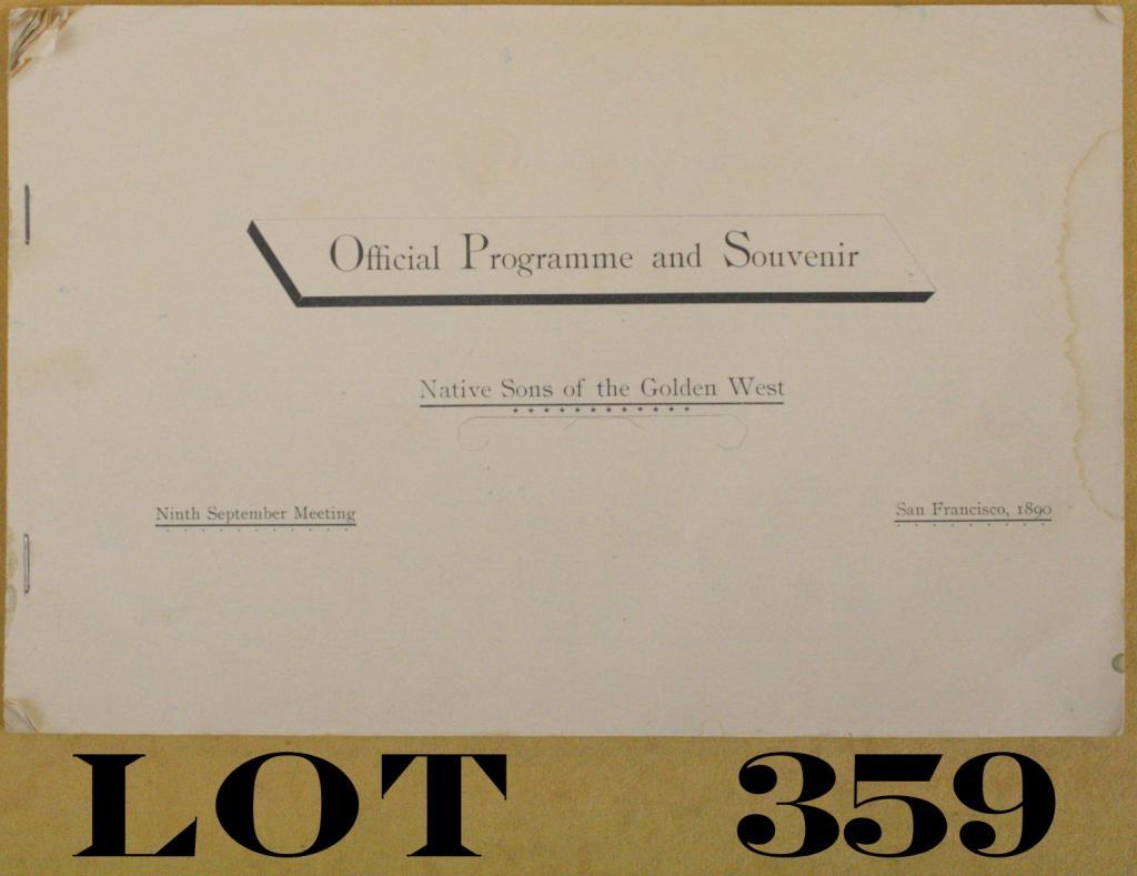 Official Programme and Souvenir of the Native Sons of the Golden West Ninth September Meeting in San Francisco, CA in 1890. The program is approx. 7” x 10” and has 62 pages of information, pictures and advertisementsof the era; overall good condition with some slight water staining on the right edge of the cover and back six pages but not obscuring any of the text. Est.: $25-$50.