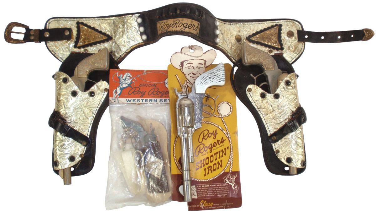Official Roy Rogers Western Set by Classy Prod. Corp. (small gun w/holster in orig pkg), Roy Rogers Shootin' Iron, Classy Prod. Corp. on orig card & Roy Rogers holster set w/guns, VG cond w/some wear in foil on belt, 30" waist.