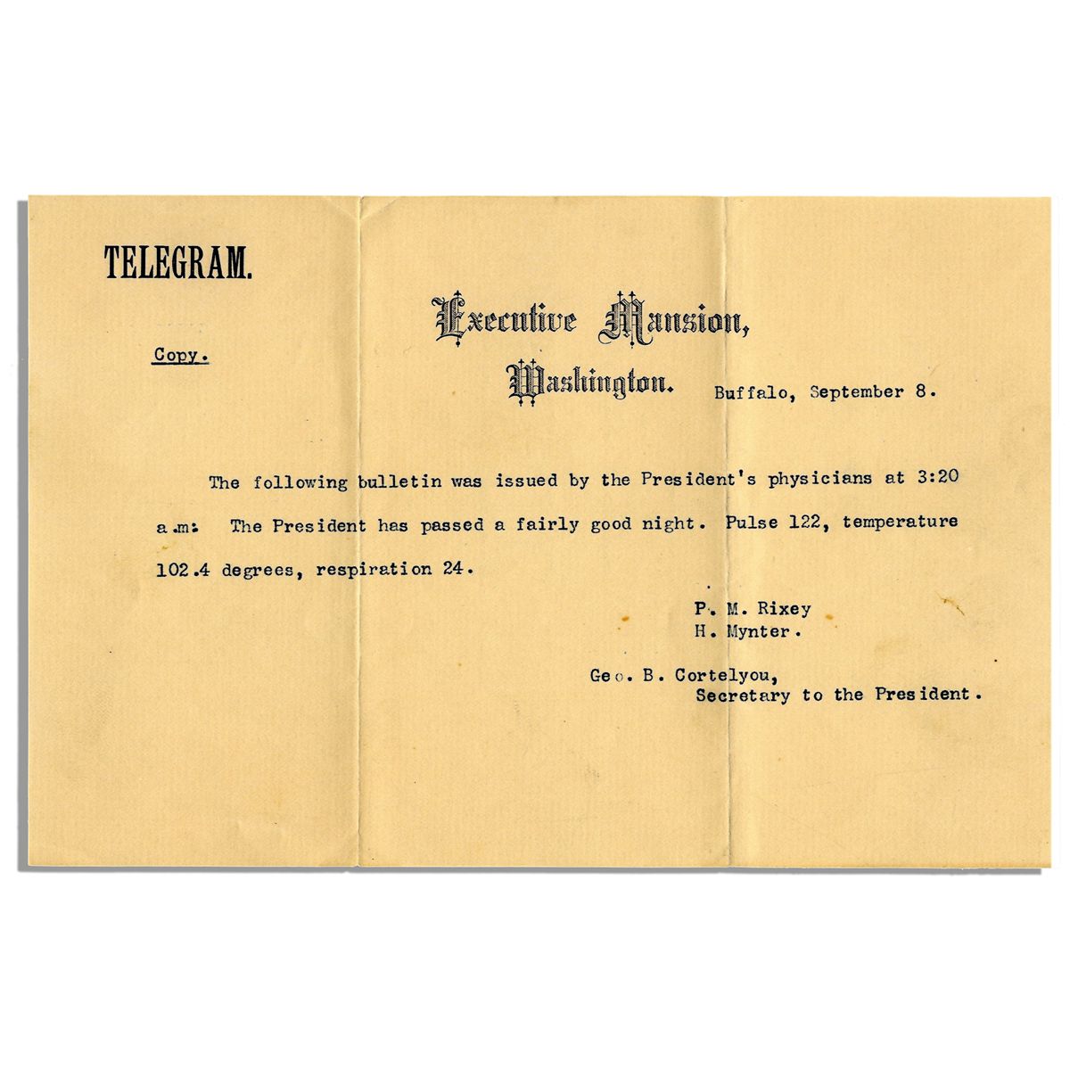 Official telegram on Executive Mansion stationery issued on 8 September 1901, two days after President William McKinley was shot in Buffalo, New York. McKinley appeared to be recovering from his wounds after being shot by anarchist Leon Czolgosz, according to this telegram, though he would die just days later on 14 September 1901. Typed telegram was issued at 3:20 am by the President's Secretary, George Cortelyou and states: ''The following bulletin was issued by the President's physicians at 3:20 a.m. The President has passed a fairly good night. Pulse 122, temperature 102.4 degrees, respiration 24.'' Telegram is marked ''Copy'' in type at top left and measures 8'' x 5.25'', with toning throughout and expected folds. Near fine.