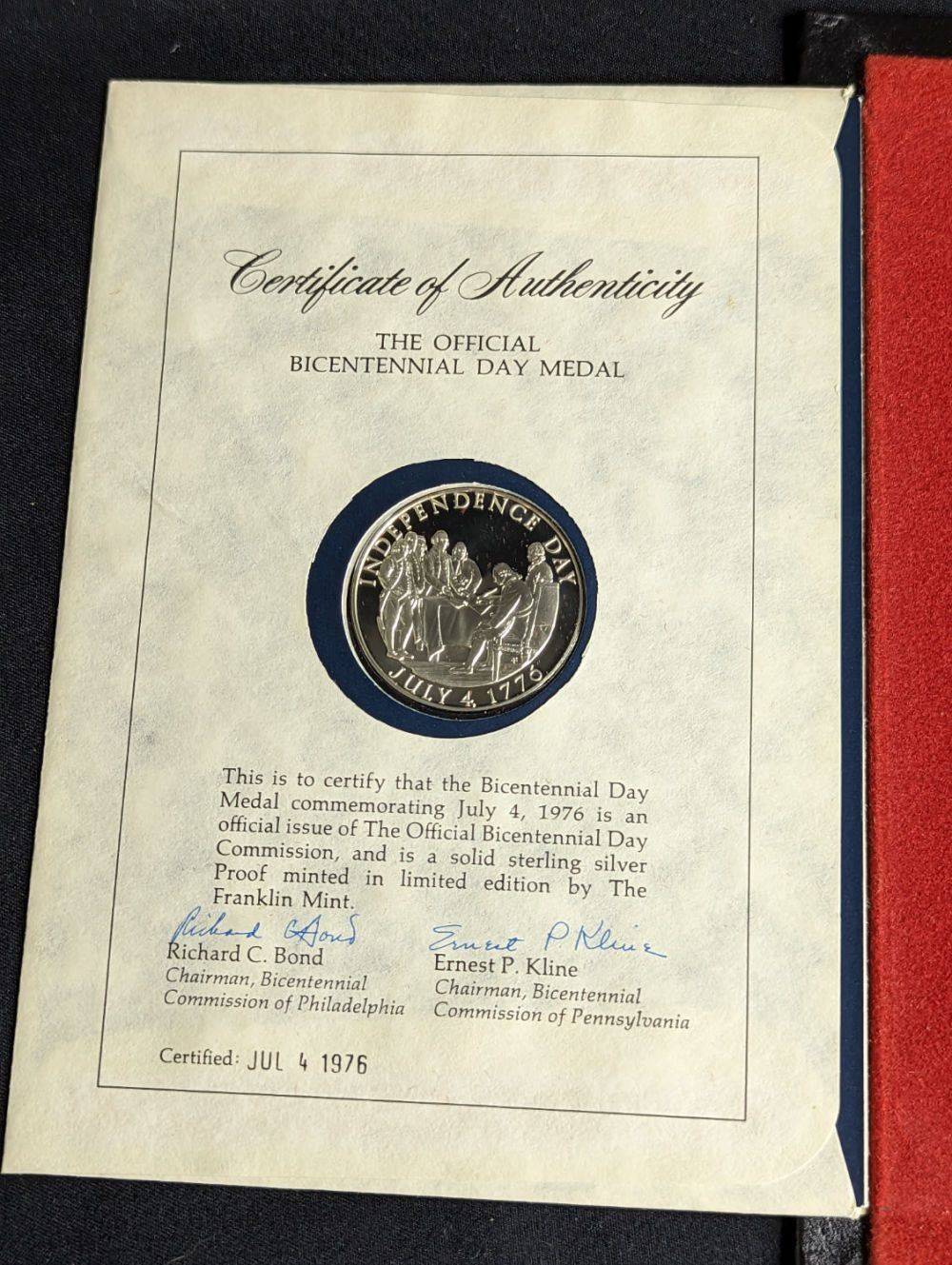 A Bicentennial Day Commemorative Medal in Sterling Silver Proof. 3/4 oz. A very cool Piece showing the signing of the declaration of independence. Stunning!