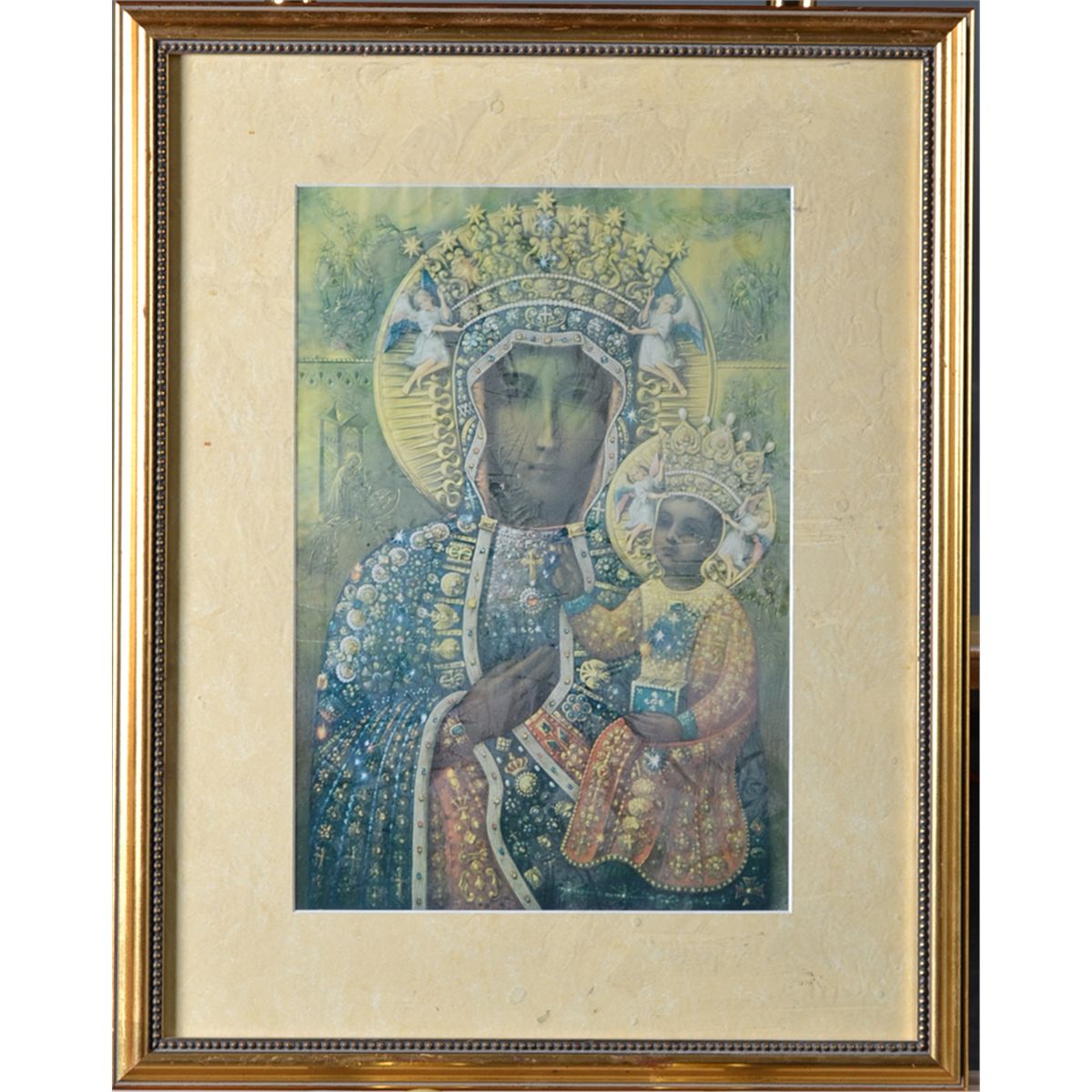 Depicting of the Madonna of Czechove (The Black Madonna), the patron saint of the Polish people and a favorite icon of Pope John Paul the great. Framed in a gold tone and beaded frame with cream mat. 13.75" H x 9.75" W, sight, 20.75" H x 16.5" W, framed. Circa mid 20th century. Provenance: Private collection of the late Benedict Markowski, a long time archivist of the Detroit Public Library.