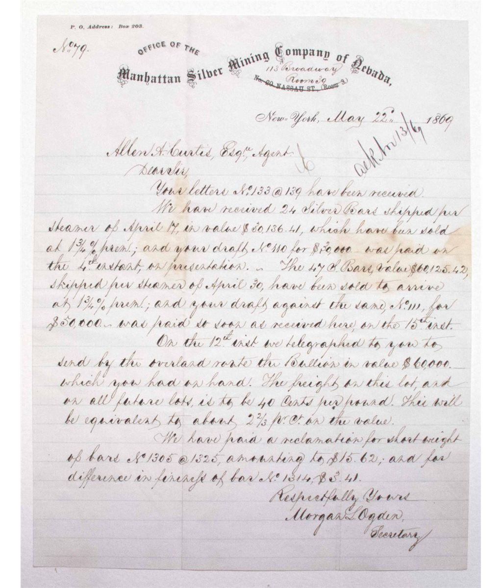 Sent to Allen A. Curtis, believed to be the assayer for letters No. 133@139 (24 silver bars in value of $30,136.41 and associated payments. Signed by Secr. Morgan L. Ogden. Letterhead on Manhattan Silver Mining Company of Nevada. Nassau St. Address lined out 113 Broadway Room 39 handwritten above. The company was the largest producer of silver in the district during this time (evident by the large issue of silver bars mentioned in the letter). The Manhattan was the first company to use the Stedfeldt Furnace, which reduced costs by half. The cost savings saved the company from bankruptcy (Abbe) and it continued producing until the late 1880's. Previously folded. Minor staining at folds. Fine.City: AustinCounty: LanderState: NV