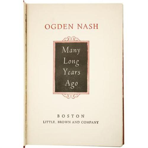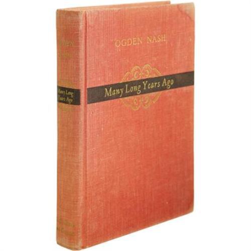 <B>Ogden Nash: Signed Slipcased Edition of <I>Many Long Years Ago</B></I>.</B></I> (Boston: Little, Brown and Company, 1945), 333 pages, red cloth with gilt lettering on the spine and front board, 8vo (5.25" x 7.75"), no dust jacket, clear Mylar protective jacket. Deckled fore-edge. Signed "<I>Ogden Nash</B></I>" on the front free endpaper below a previous owner's inscription. A compendium of Nash's favorite poems from five previously released works plus 31 previously unpublished poems. The book is in good condition, with moderate shelf wear, lightly bumped corners, some fading to the edges, especially at the top right corner of the front board. The textblock is largely clean and bright, with some soiling to the top edge. Front hinge starting at the title page. The book comes housed in a custom red quarter leather slipcase with gilt titles and five raised bands on the spine. Ogden Nash's signature is scarce, and signed editions of his book are rare. This is an ideal book for a collector of signed modern editions.<BR><BR><b>Shipping:</b> Books & Catalogs (<a target="_blank" href="http://www.heritageauctions.com/common/shipping.php">view shipping information</a>)