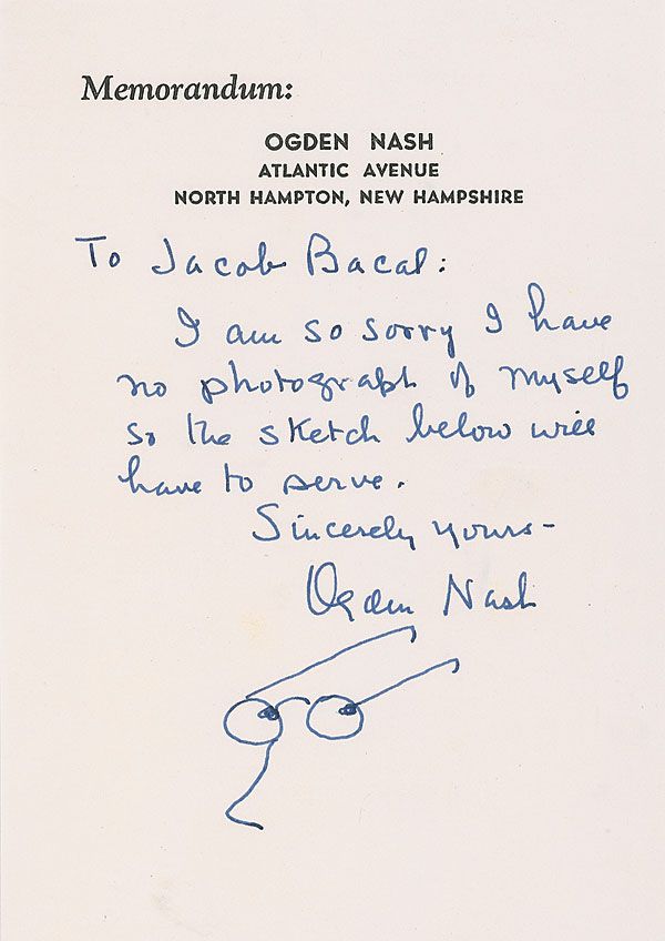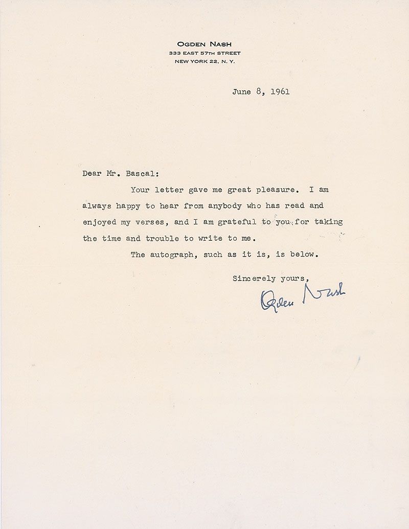 Two letters: one ALS, one page, 4 x 6, personal letterhead, no date. In full: “I am so sorry I have no photograph of myself so the sketch below will have to do,” with a humorous self-portrait sketched below; and one TLS, one onionskin page, 8.5 x 11, personal letterhead, June 8, 1961. In part: “I am always happy to hear from anybody who has read and enjoyed my verses.” In overall fine condition, with a few light creases. Accompanied by the original mailing envelope for the TLS.
