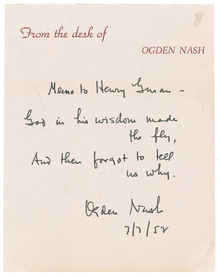 American writer (1902–1971) best known for his humorous verse. AQS on an off-white 4.25 x 5.5 sheet of his personal letterhead, inscribed at the top, “Memo to Henry Guam.” Nash writes, “God in his wisdom made the fly, And then forgot to tell us why.” Signed at the bottom, “Ogden Nash 7/7/52.” In fine condition, with a bisecting horizontal fold, and a small fingerprint to top right. Pre-certified PSA/DNA and RRAuction COA.