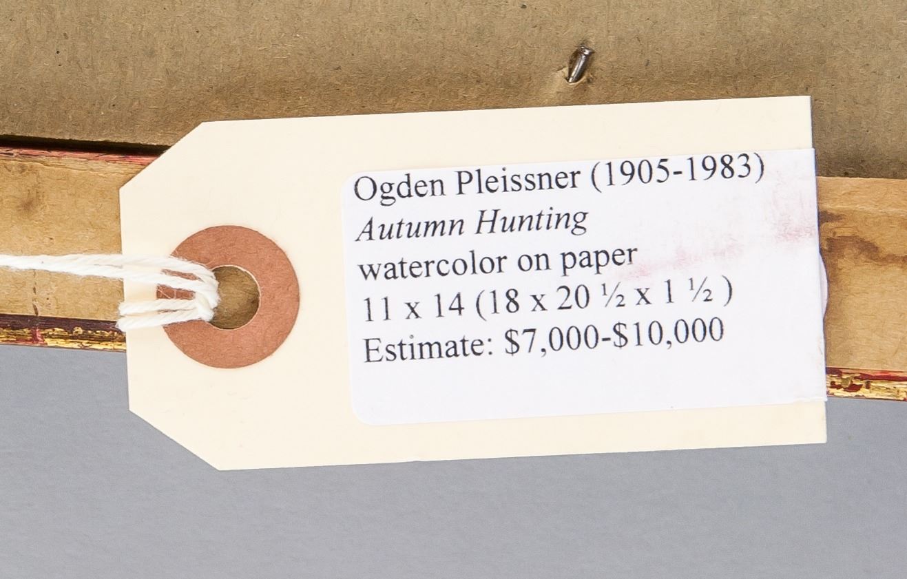 Watercolor on paper painting, entitled "Autumn Hunting." Signed and attr. Ogden Pleissner (American, 1905-1983) on lower right corner. 10.75 x 13.75 in (27.3 x 34.9 cm). Ogden Minton Pleissner is known for his landscapes of the American West, as well as images of the Canadian Maritimes and New England. Growing up, Pleissner spent summers in Wyoming where he developed a life-long love of the outdoors and drawing landscape. At the start of World War II, commissioned as a captain in the Air Force, Pleissner served as a war artist in the Aleutian Islands, and by 1942 was a war correspondent for Life magazine. After the war, he turned to painting city- and landscapes and sporting events. PROVENANCE: Upper New York Estate