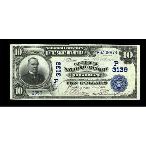 <B>Ogden, UT</B></I> - $10 1902 Date Back Fr. 616 <B>The Commercial NB</B></I> Ch. # (P)3139<BR> Our consignor seldom bothered to obtain more than one note per title in both large and small size for any Utah bank, but when the opportunity to obtain this beauty arose in 1999 the quality of this note made it impossible to resist. This is easily the finest grade of the seven known state examples from this bank, with the eye appeal of a note pulled from the press this morning. The colors are bold, the embossing still fully evident, and the paper quality pristine save for the folds likely caused by storage and not circulation. <B>Extremely Fine,</B></I> a note fit for even the most discriminating of collectors. <BR><BR><b>Shipping:</b> Coins & Currency (<a target="_blank" href="http://www.heritageauctions.com/common/shipping.php">view shipping information</a>)