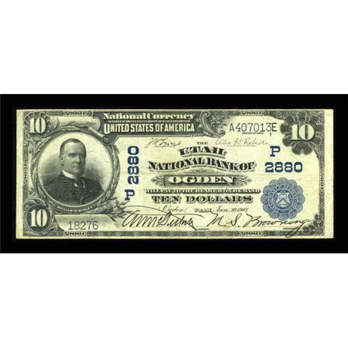 <B>Ogden, UT</B></I> - $10 1902 Plain Back Fr. 624 <B>The Utah NB</B></I> Ch. # (P)2880<BR> Large notes only from this considerably scarcer Ogden bank, which went out in 1922. Offerings, particularly of nice examples, have been few and far between in recent years. <B>Fine-Very Fine,</B></I> with bold black signatures. <BR><BR><b>Shipping:</b> Coins & Currency (<a target="_blank" href="http://www.heritageauctions.com/common/shipping.php">view shipping information</a>)