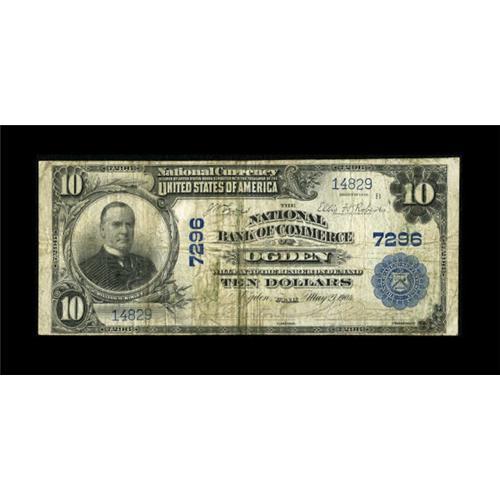 <B>Ogden, UT</B></I> - $10 1902 Plain Back Fr. 624 <B>The NB of Commerce</B></I> Ch. # 7296<BR> Harrison Barton and Chas. Barton signed this issue that is an evenly circulated and attractive example for the grade. A light film was applied over the signatures to prevent fading. <B>Fine.</B></I><BR><BR><b>Shipping:</b> Coins & Currency (<a target="_blank" href="http://www.heritageauctions.com/common/shipping.php">view shipping information</a>)