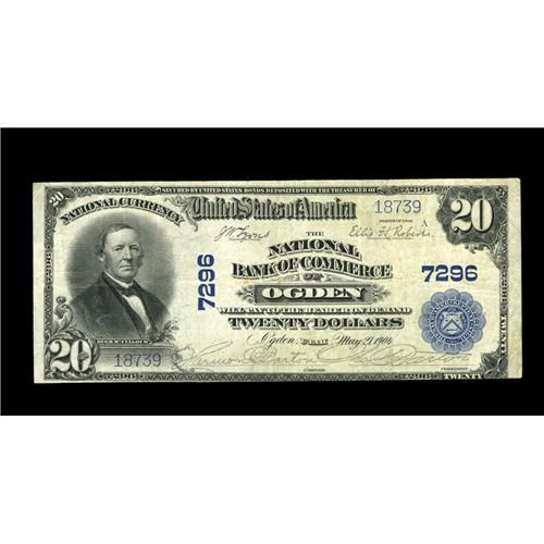 <B>Ogden, UT</B></I> - $20 1902 Plain Back Fr. 650 <B>The NB of Commerce</B></I> Ch. # 7296<BR>A nice note bearing the second title used here. <B>Fine-Very Fine,</B></I> with the bottom margin trimmed a bit close.