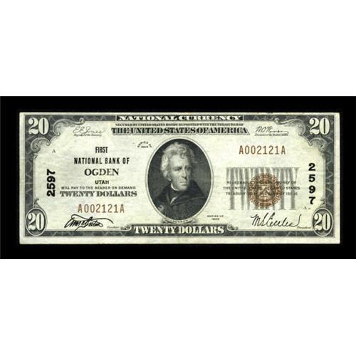 <B>Ogden, UT</B></I> - $20 1929 Ty. 1 <B>The First NB</B></I> Ch. # 2597<BR> A high grade small size example bearing the bank's fourth title. <B>Very Fine-Extremely Fine.</B></I><BR><BR><b>Shipping:</b> Coins & Currency (<a target="_blank" href="http://www.heritageauctions.com/common/shipping.php">view shipping information</a>)