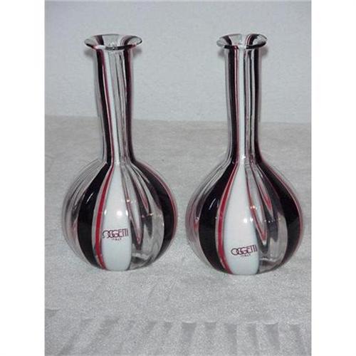 A pair of hand blown glass vases, made in Italy by Oggetti. 7 1/2" tall, 3 3/4" diameter, the vases are decorated with red, white, & black, contemporary design. Signed with label "Oggetti Italy" sticker. Condition is very good no chips or cracks. (2)
