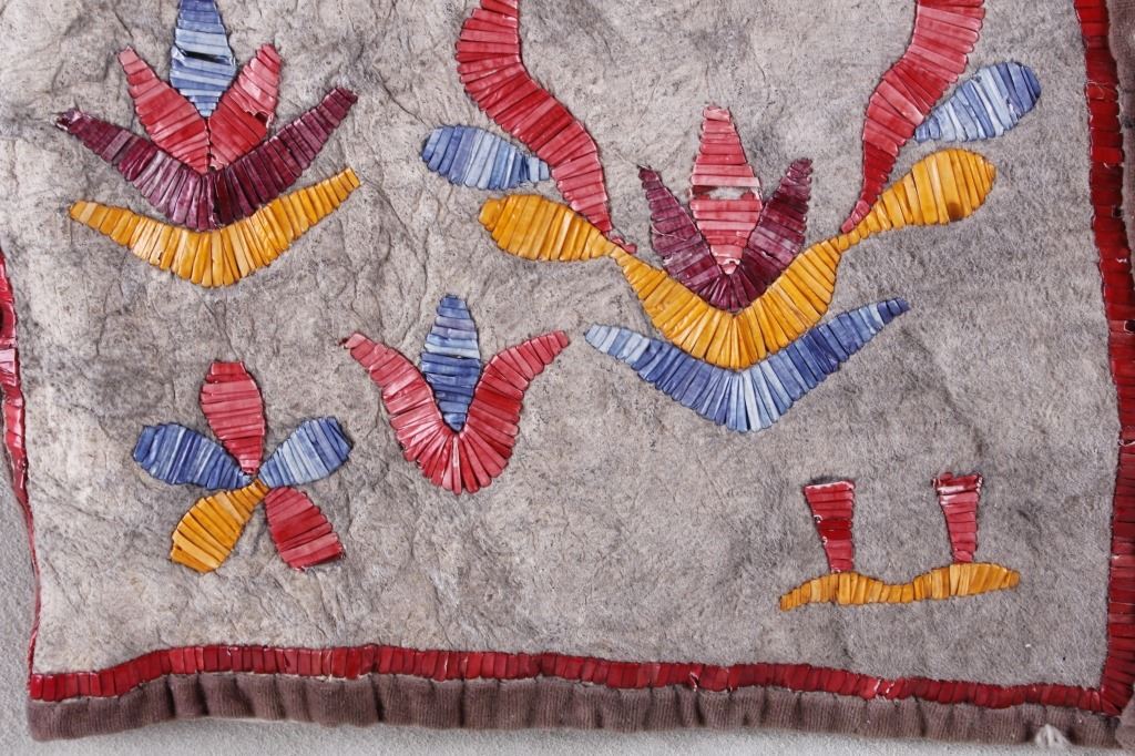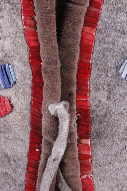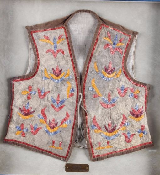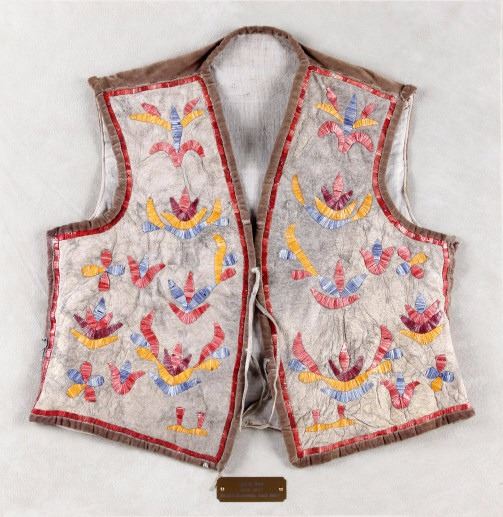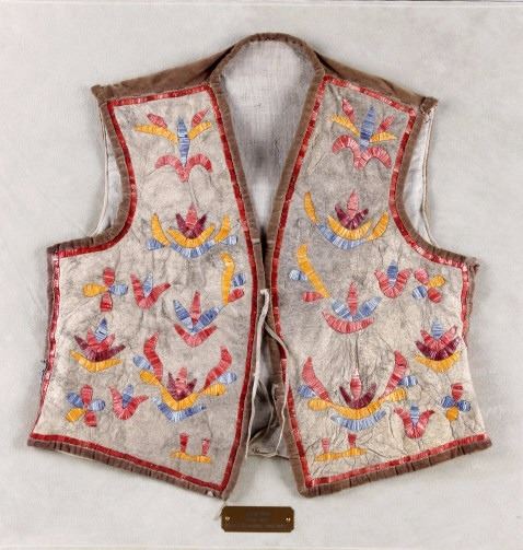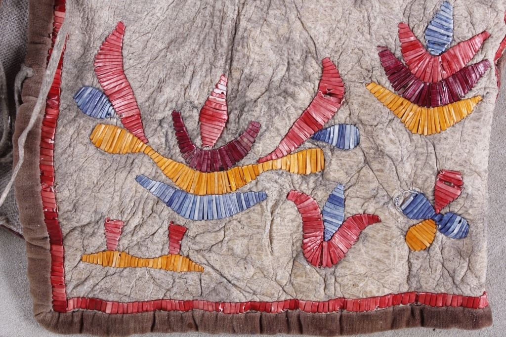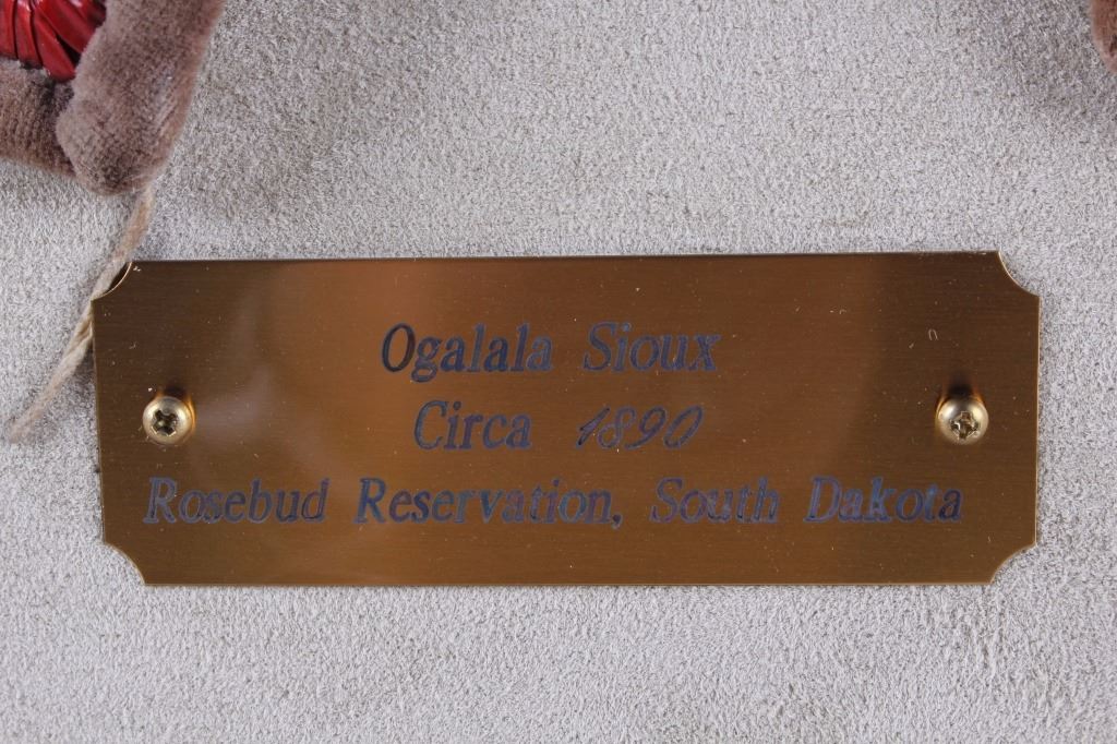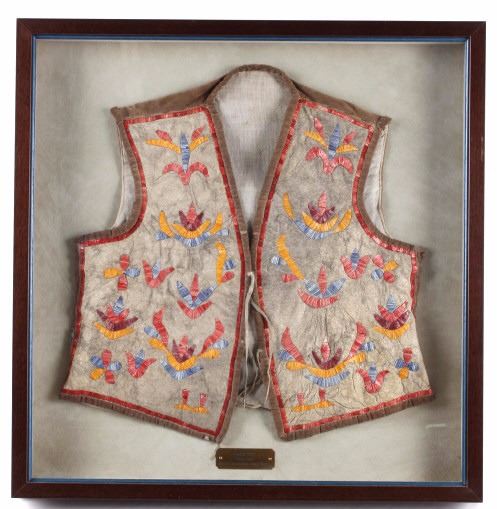This is an exceptional authentic original Oglala Sioux Native American Indian Quilled Vest from circa 1890. The vest shows an early trade cloth construction back with Buffalo Indian tanned hide front showing excellent porcupine quill work with red, blue, orange mineral ocher dye in a fantastic pattern. The piece has been wonderfully preserved showing excellent quality and condition. The front of the vest is framed in red ocher dyed porcupine quillwork with various pictorial geometric patterns throughout and shows two hide ties in the center. Provenance: From a large Old West & Native American private collection in Northwestern Montana and was recovered from the Rosebud Reservation circa 1890 in South Dakota. This has been finely mounted in a shadow box frame for display under glass for preservation and on a suede leather like backing (the vest can be removed from the shadow box for shipping or other displaying options). Brass tag is marked, “Oglala Sioux - Circa 1890 - Rosebud Reservation, South Dakota.” One of the finest quill work vest from the 19th century we have offered for sale. The shadow box frame measures 23”W x 23.5”L x 2.75”D. The vest as displayed measures 18.75"W x 19"H. Condition: Little to no quillwork loss, supple hide, and overall fine museum quality condition for its age.