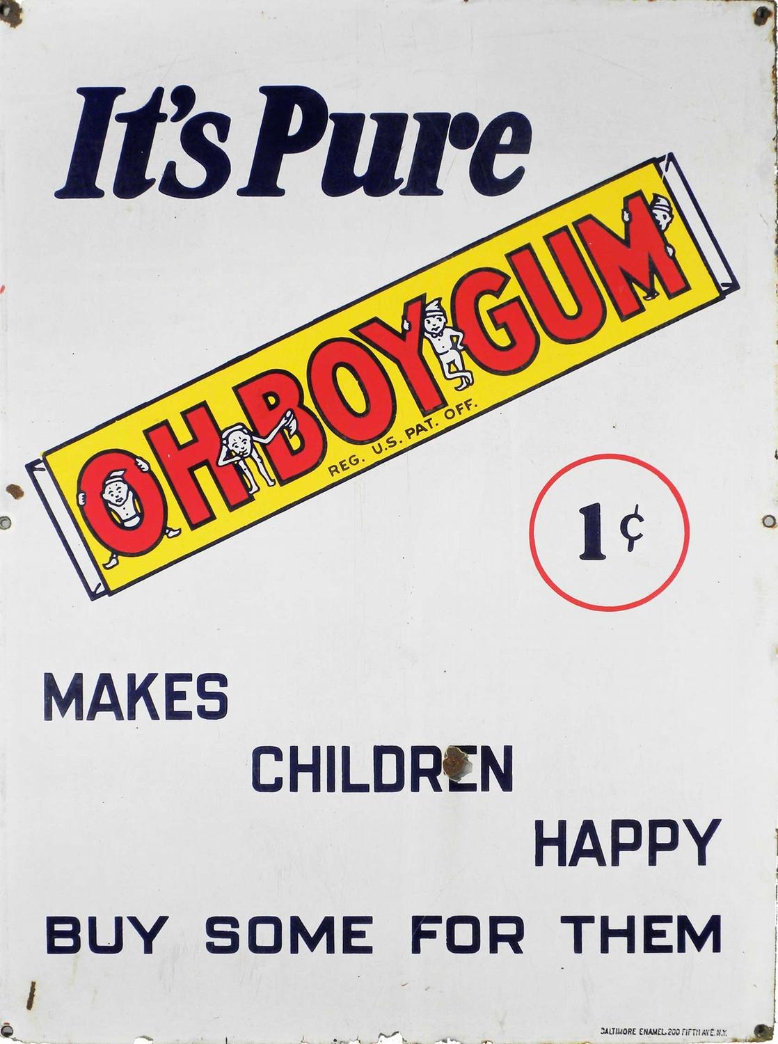 Oh Boy Gum Porcelain Sign. One cent. Some small chips around the edges otherwise very good condition. 21 X 28 1/2 inches.