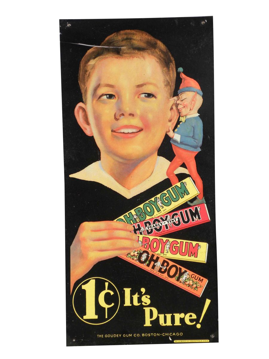 Oh' Boy Gum Tin Sign. The Goudey Gum Company, Boston and Chicago. H.D. Beach Company lithographer. 3 inch scratch at 11:00 otherwise excellent condition. 7 1/4 X 15 1/2 inches.