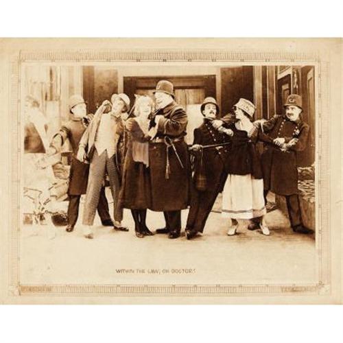 <B>Oh Doctor! (Paramount, 1917).</B></I> Lobby Card (11" X 14"). In 1917 walking on a New York street with a friend, Fatty Arbuckle was introduced to a young man his friend knew. He invited this fellow over to his Coney Island film studio, and the two began making the first of some sixteen films together. Thus began one of the greatest collaborations in screen comedy history with young Buster Keaton. This is the fourth film in which they collaborate before Keaton would depart on his own. This scene never occurs in the short but the lobby was taken from a staged publicity still, in which Keaton was asked to stand-in as a policeman. Of course, he never appeared as such in the short. Here they are in one of their best collaborations in a very rare card. Keaton would return the favor in later years, supporting Arbuckle after the Virginia Rappe scandal curtailed Arbuckle's career. There are pinholes, diagonal creases in the top left and right corners, minor edge wear with tiny tears, older restoration in the center and lower right field to address a punch and surface paper loss. Fine-. <BR><BR><b>Shipping:</b> Flat Material, Small (<a target="_blank" href="http://www.heritageauctions.com/common/shipping.php">view shipping information</a>)