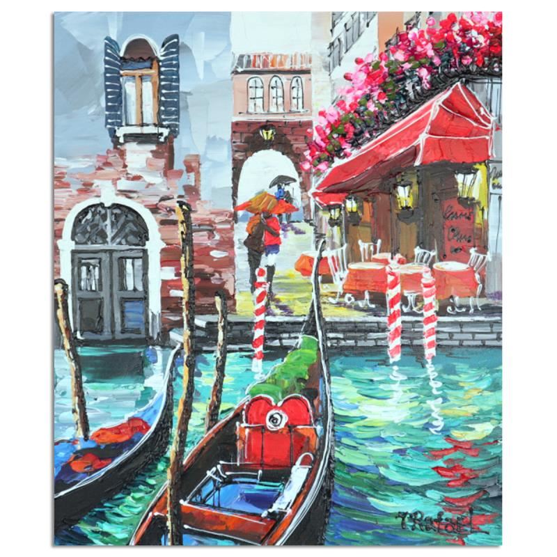 "Oh, Venice!" is an original painting, acrylic on stretched canvas by Yana Rafael. Hand signed by the artist, the piece includes a letter of authenticity. Measures approximately 20" x 24" (image).