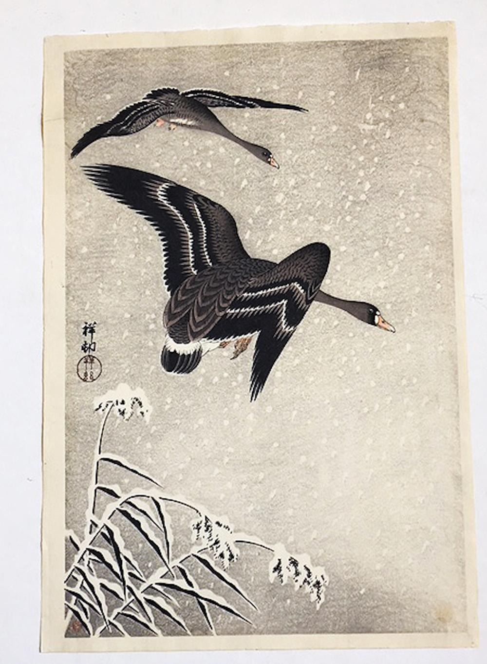 Ohara Koson- Geese in Snowstorm. Measures at 15 x 10 1/4 inches. FINE CONDITION